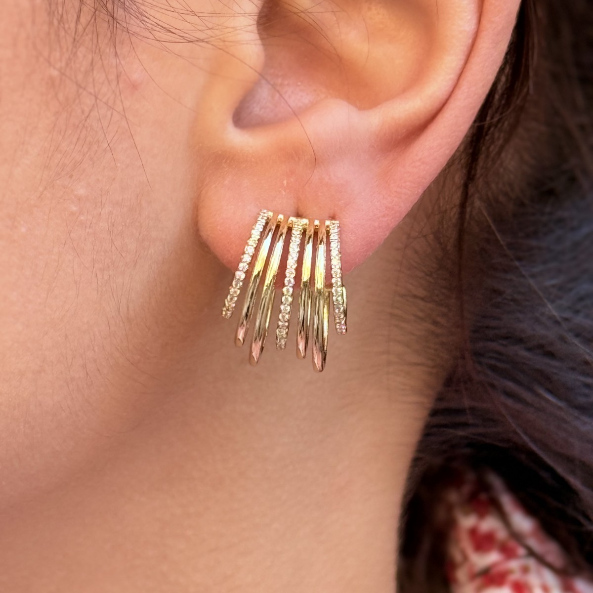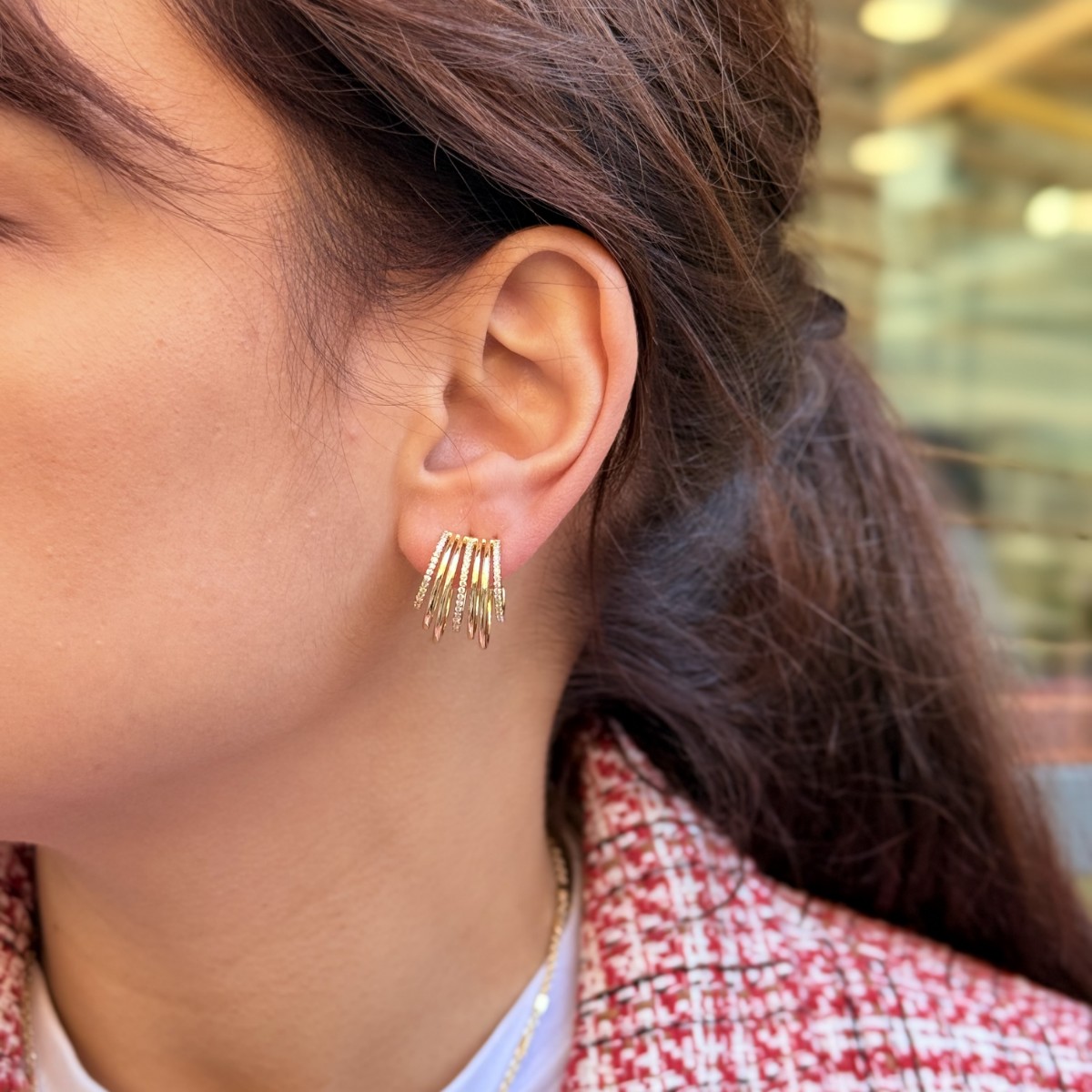 Modern zarafet ile çok halkalı tasarımın buluştuğu bu model, kulağa hacim kazandıran hafif bir şıklık sunar.