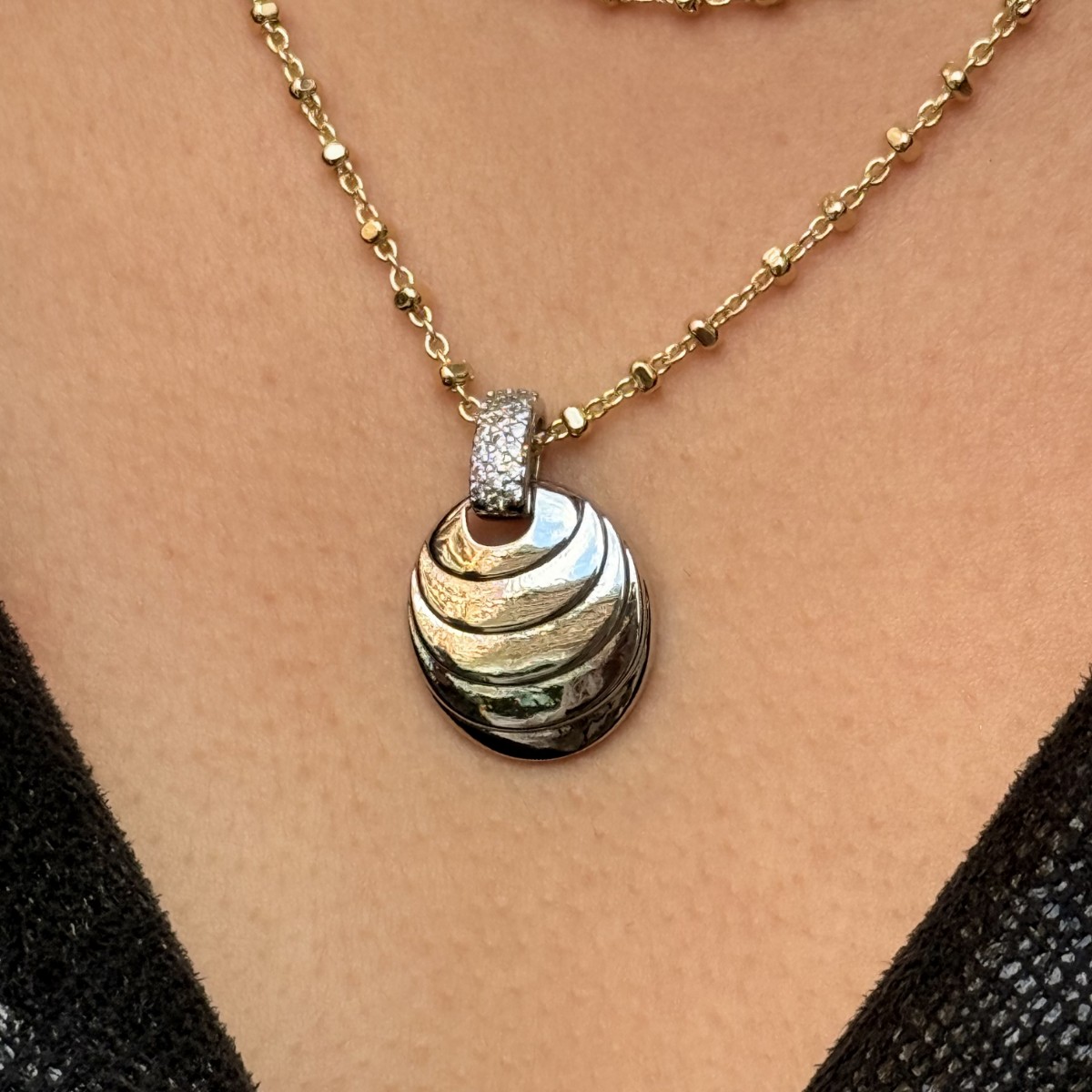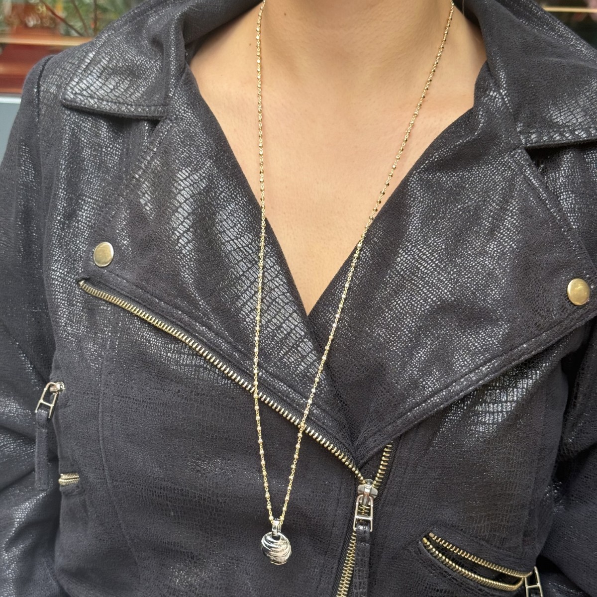 Zincirin katmanlı formu ve dalgalı yüzeyiyle modern bir ışıltı sunar; sade tarzlara zarif bir derinlik katar. Ürün uzundur, görselde iki kat dolanmıştır.