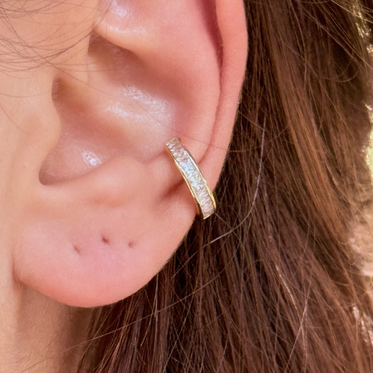 İnce formu ve parlak taş dizilimiyle kulağa zarif bir ışıltı katan altın kıkırdak küpe.