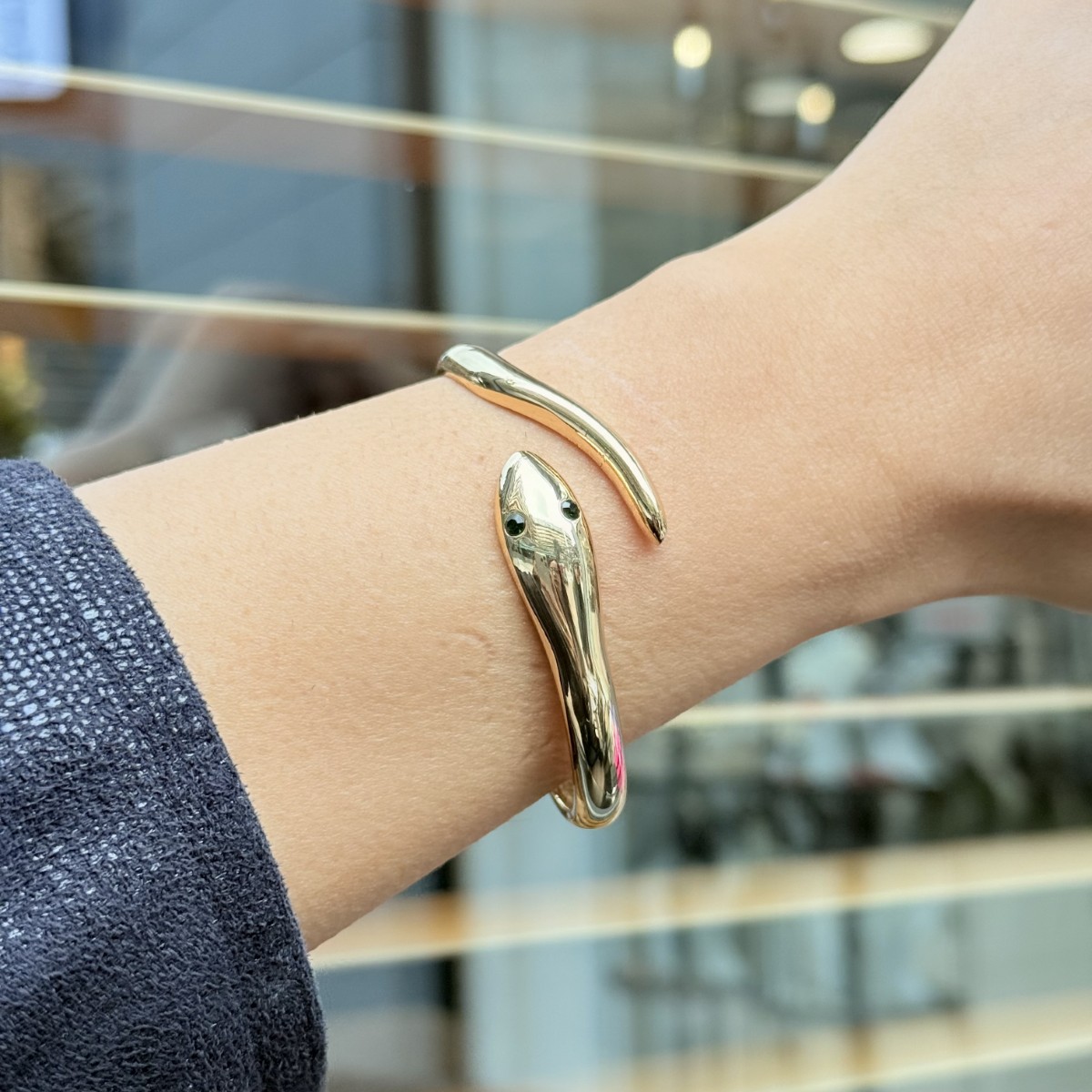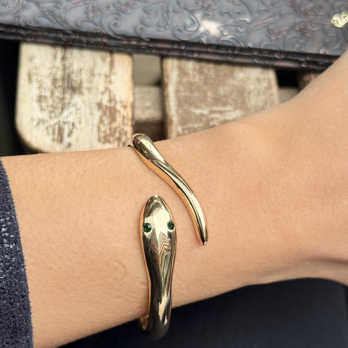 Altın tonuyla sofistike bir duruş sunan, yeşil taş gözlü yılan bileklik.