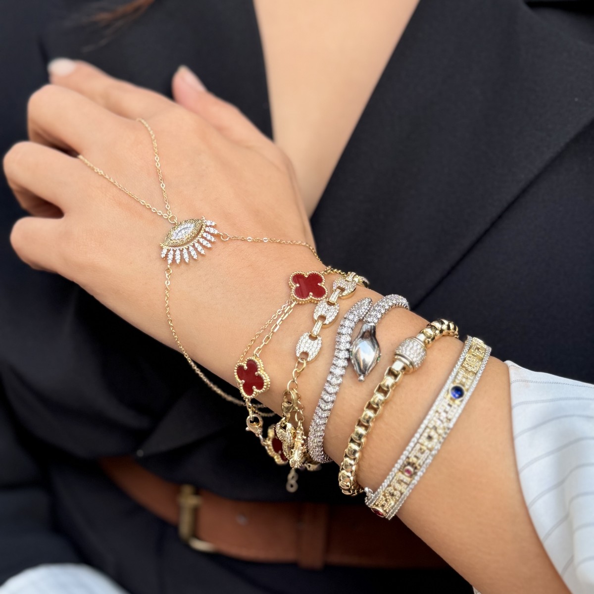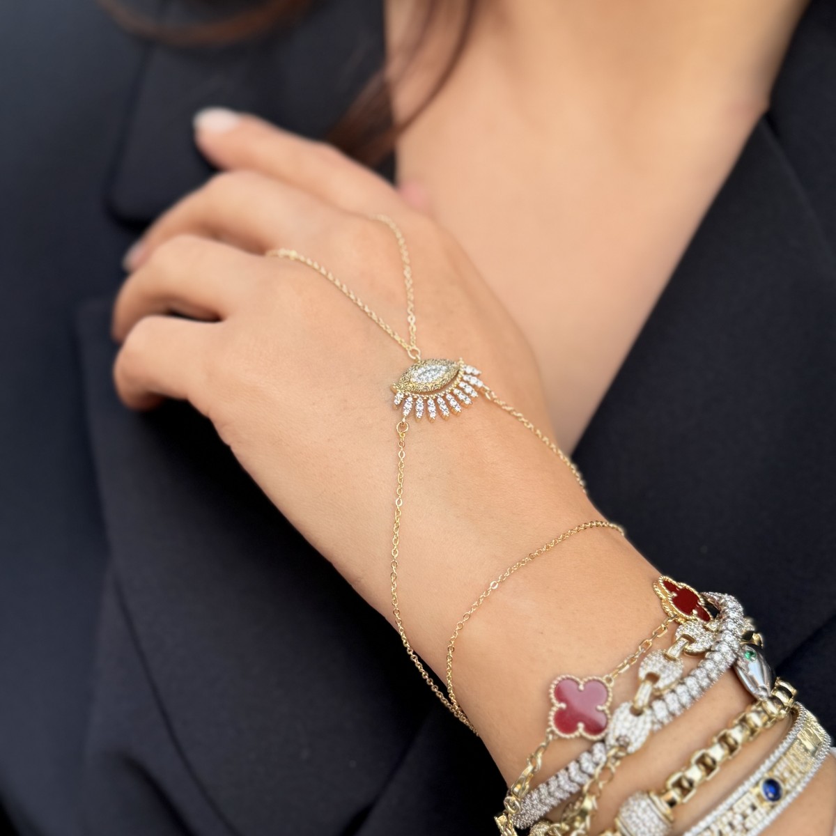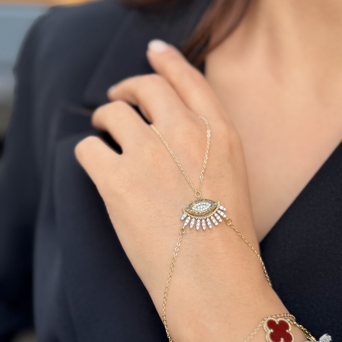 Merkezde göz motifi ve kirpik detaylı taşlı form; modern nazar yorumu.