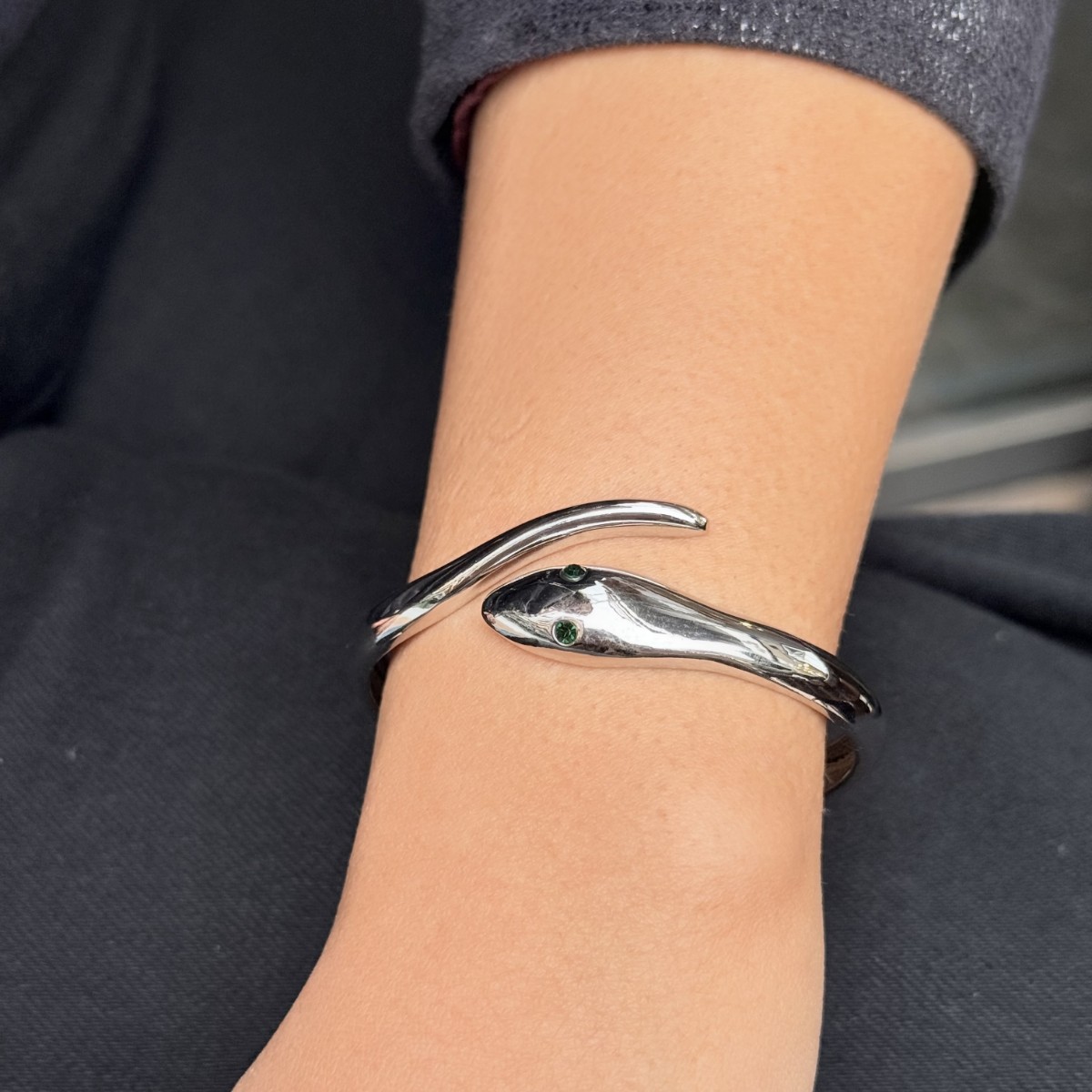 Yeşil taşlı gözleriyle karakteristik görünüm kazanan, esnek formlu yılan bileklik.