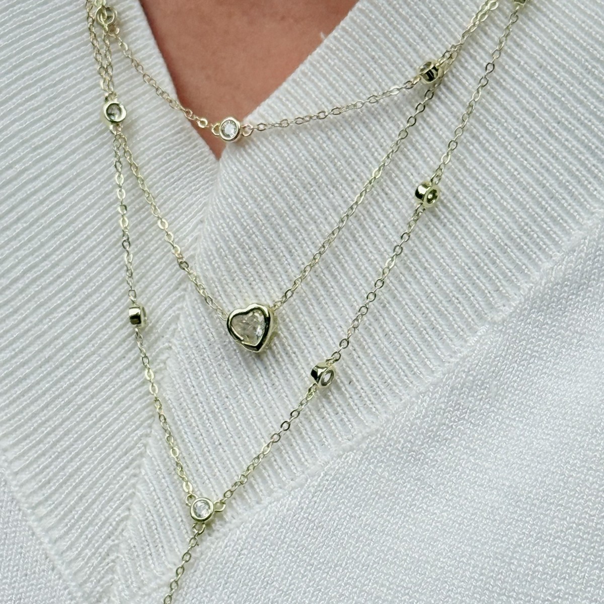 İnce zincirlerin farklı katmanlarla birleştiği bu model, küçük taşlar ve kalp figürüyle romantik bir şıklık sunar. Katmanlı kolye trendini sevenler için özel bir parça.