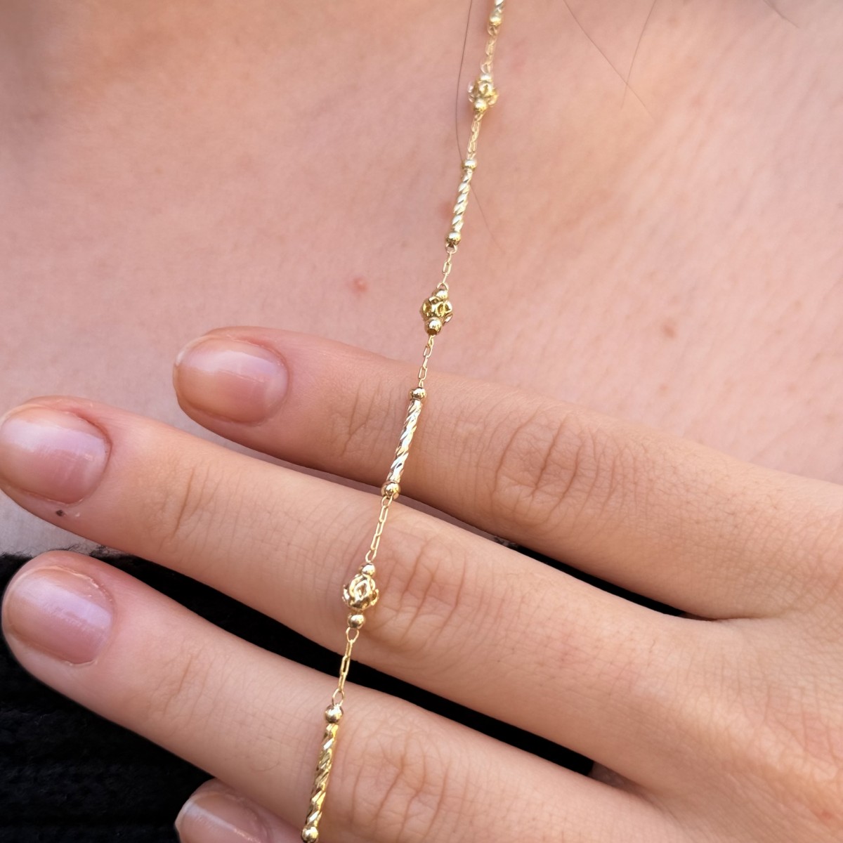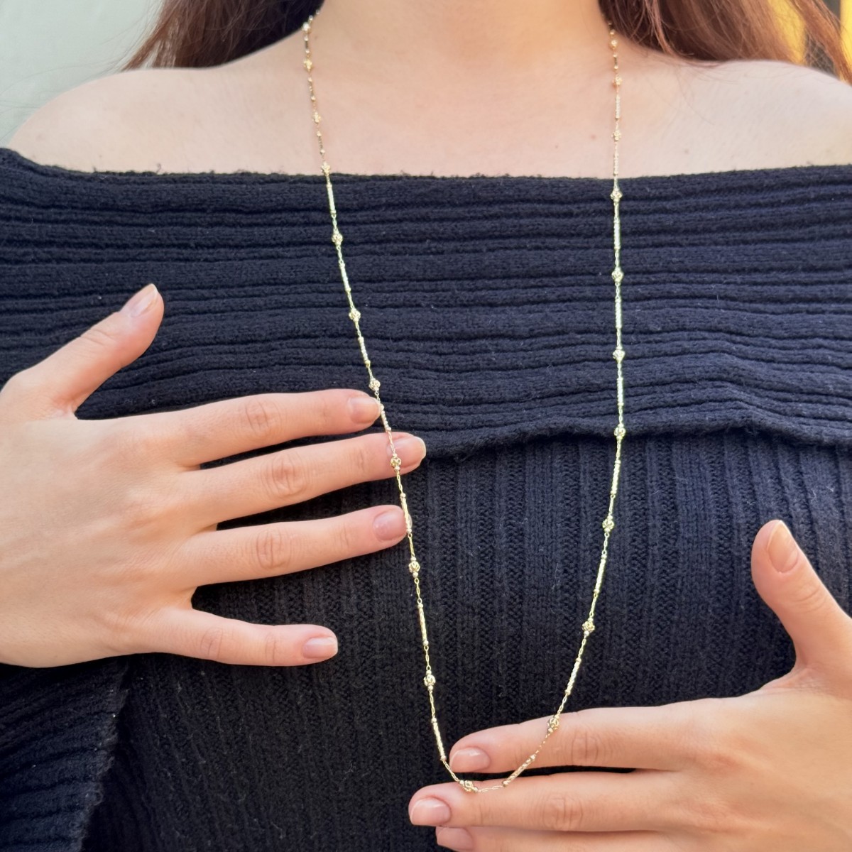 Hafif, ara düğüm detaylı uzun zincir; katmanlamaya ideal.
