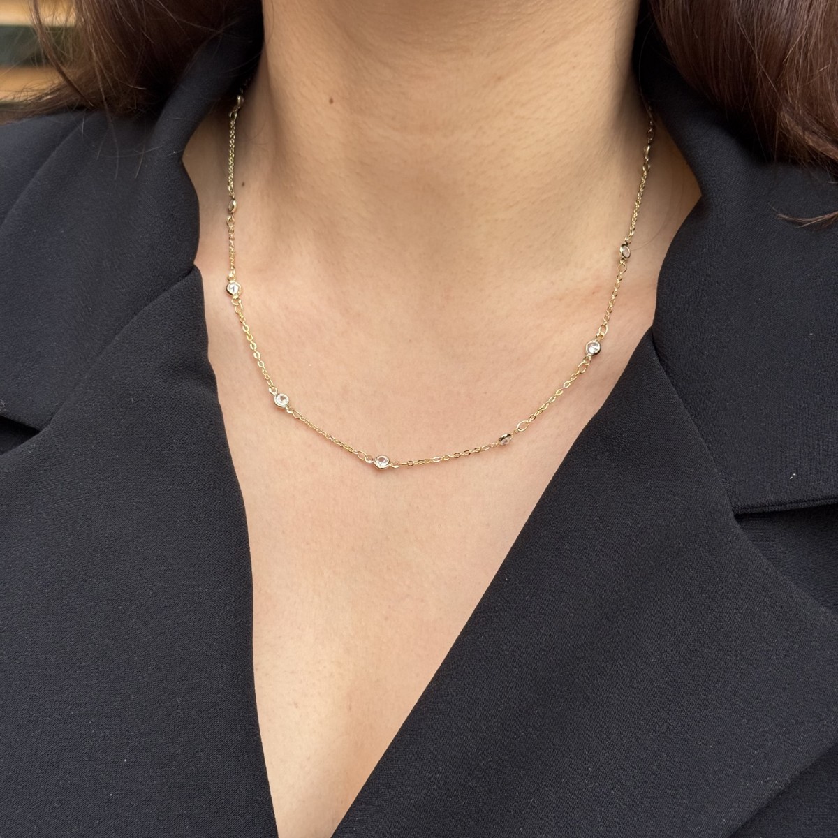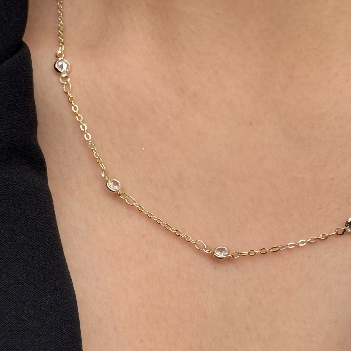 Küçük yuvarlak taş istasyonlarıyla günlük kullanıma uygun minimal kolye.