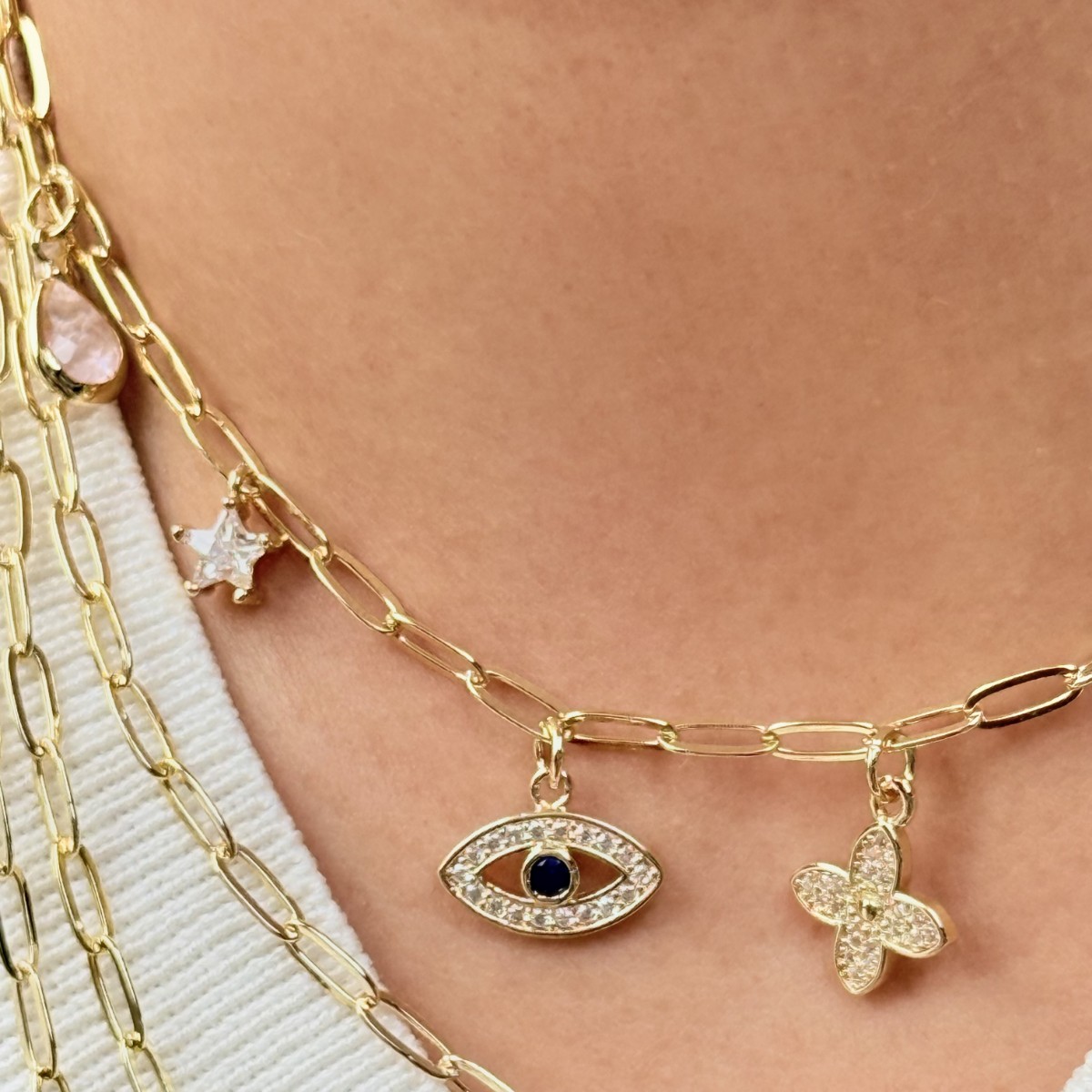 Nazar boncuğu, yonca ve yıldız figürlerinin birleştiği bu çok katlı kolye, hem anlamlı hem de şık bir stil yaratır.