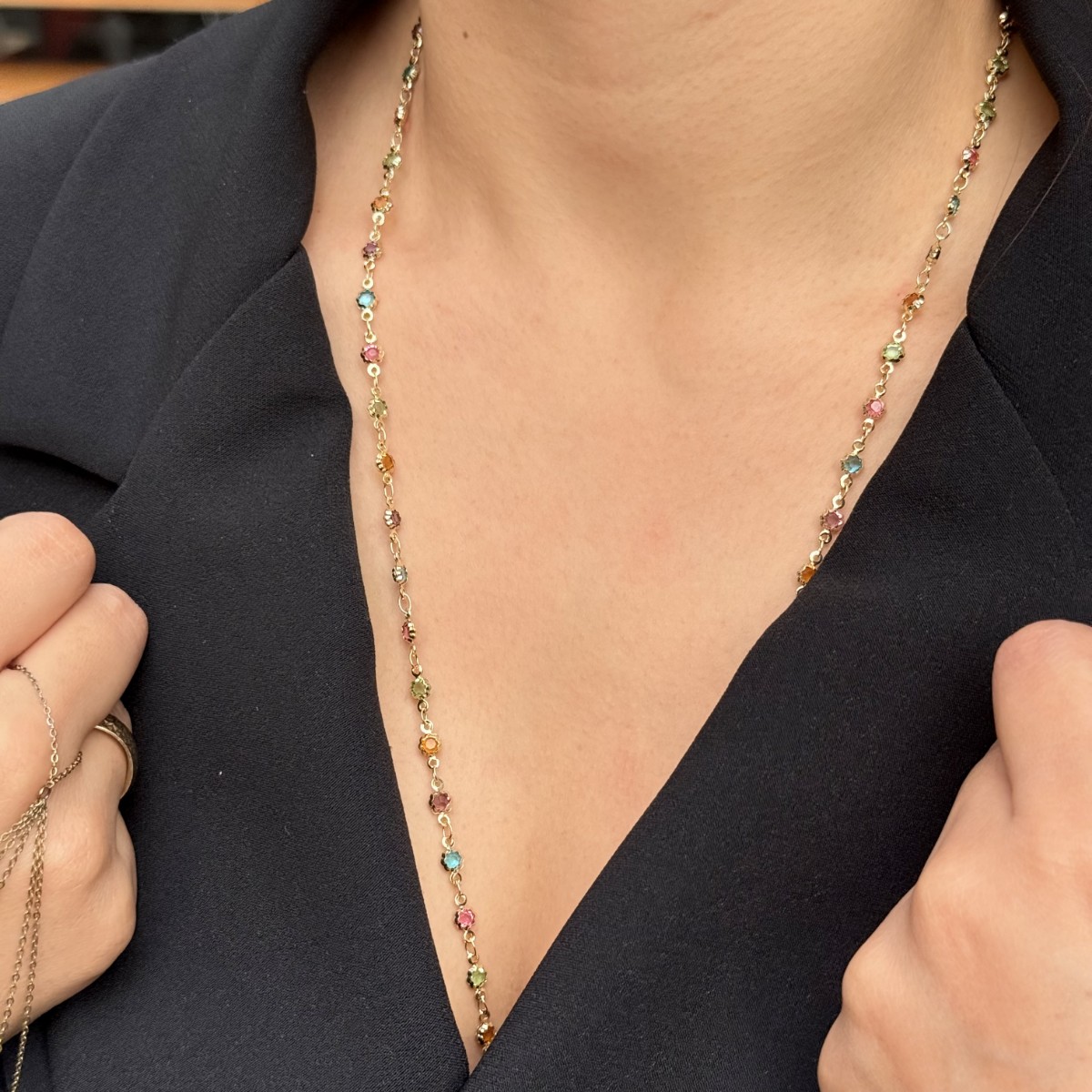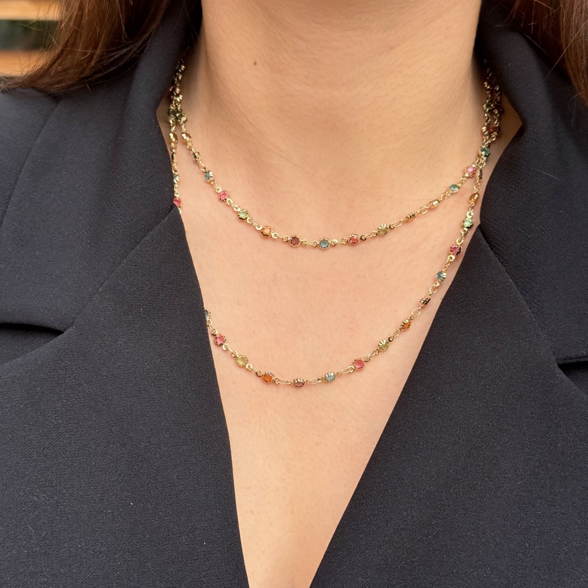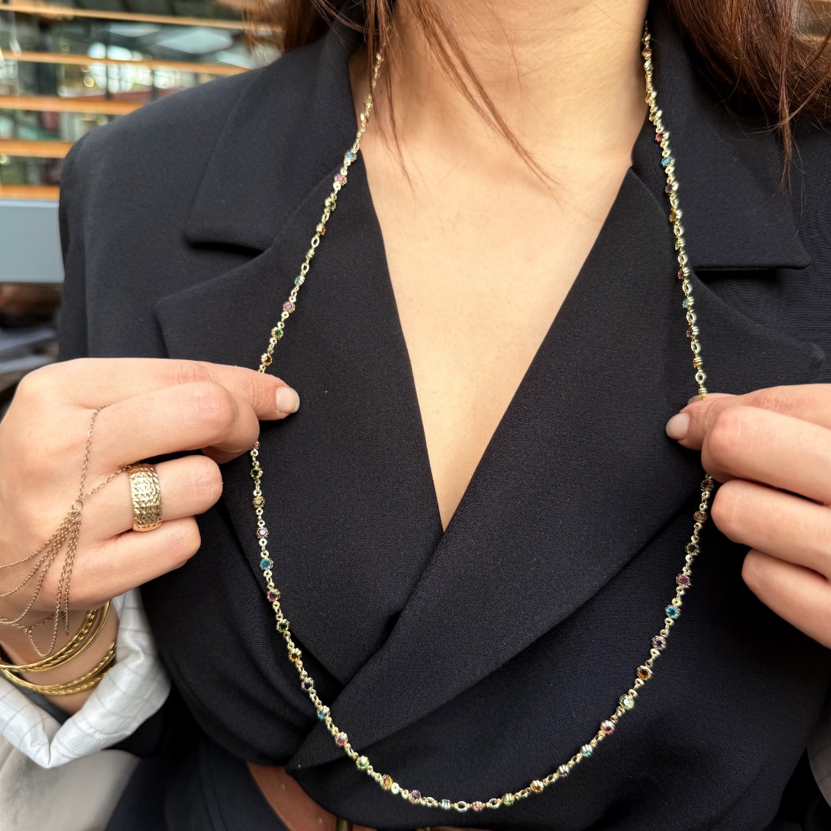 Pastel tonlarda renkli taş dizilimi. Yaz-kış canlı bir dokunuş. İlk görselde kolye iki kez dolandırılarak kombinlenmiştir.
