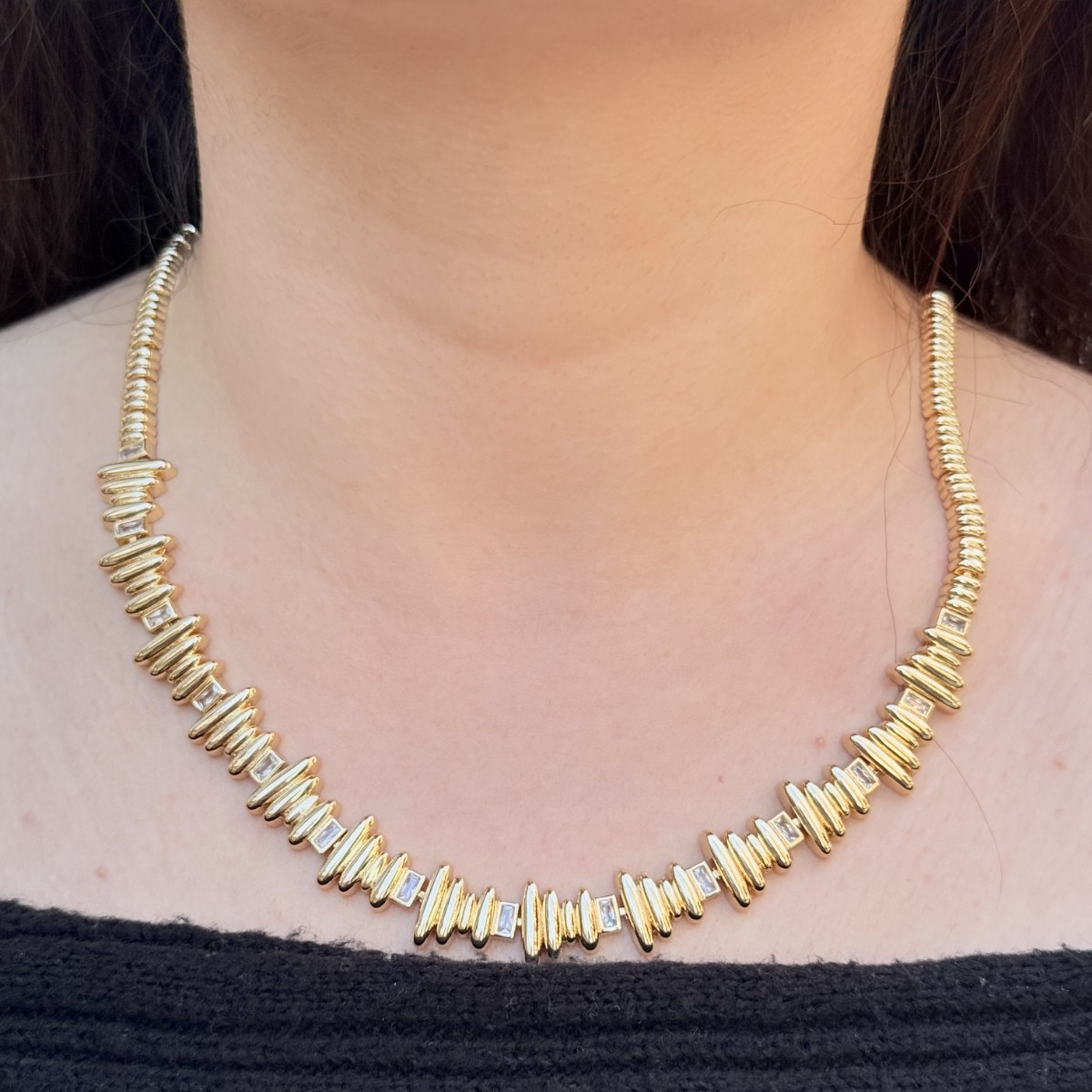 Spiral gövdeli, aralıklı baget taş detaylı statement kolye.