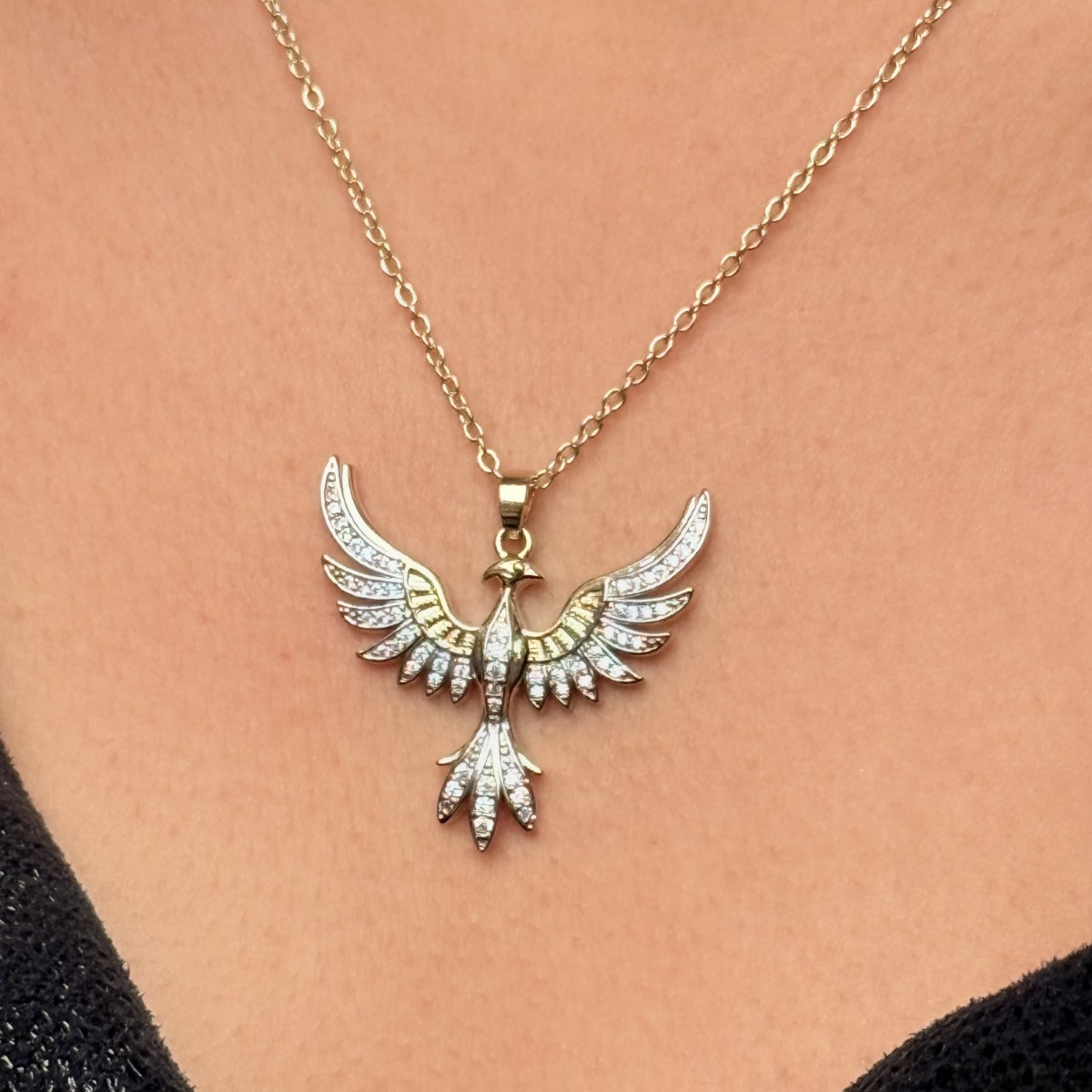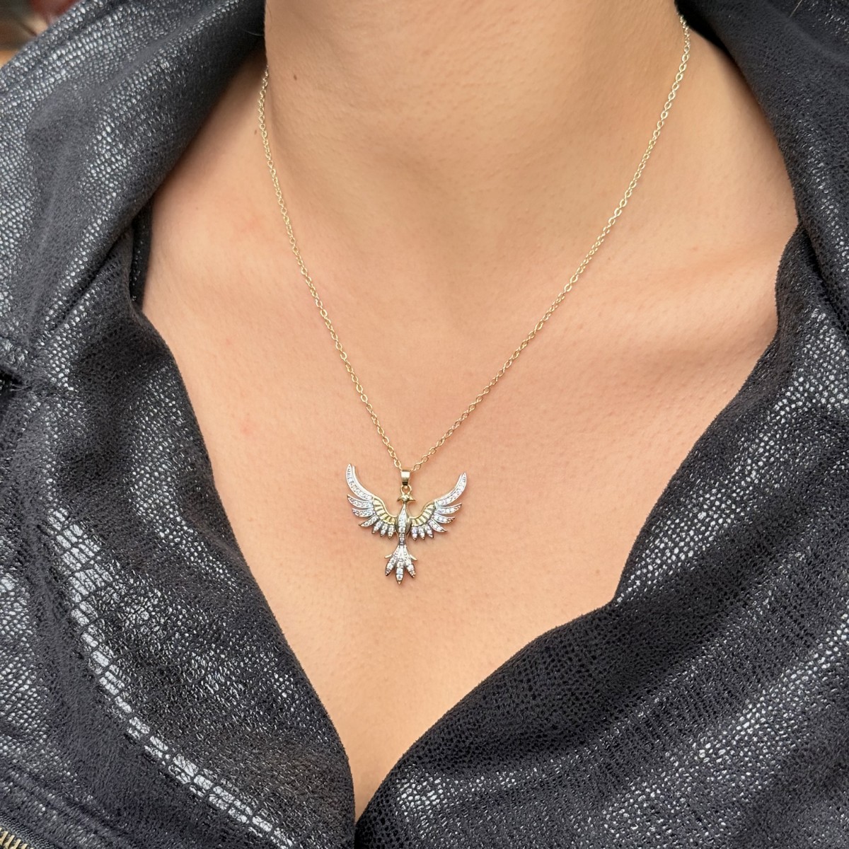 Yeniden doğuşu simgeleyen taşlı anka kuşu formuyla zarafeti ve gücü bir arada sunan kolye.