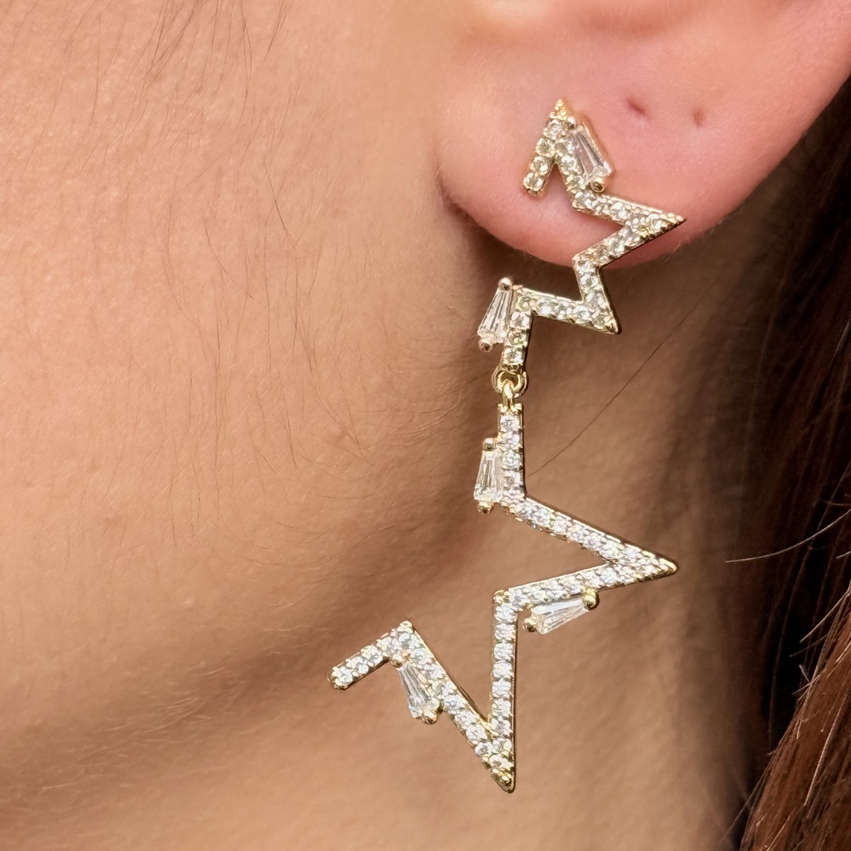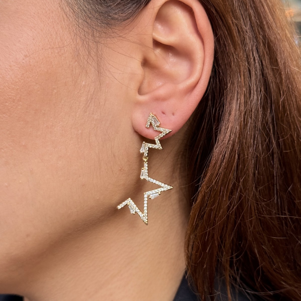 Şimşek siluetli sallantı; kenarlarda mikro taş, baguette kesim ara taşlarla ritim. Sarı altın ton.