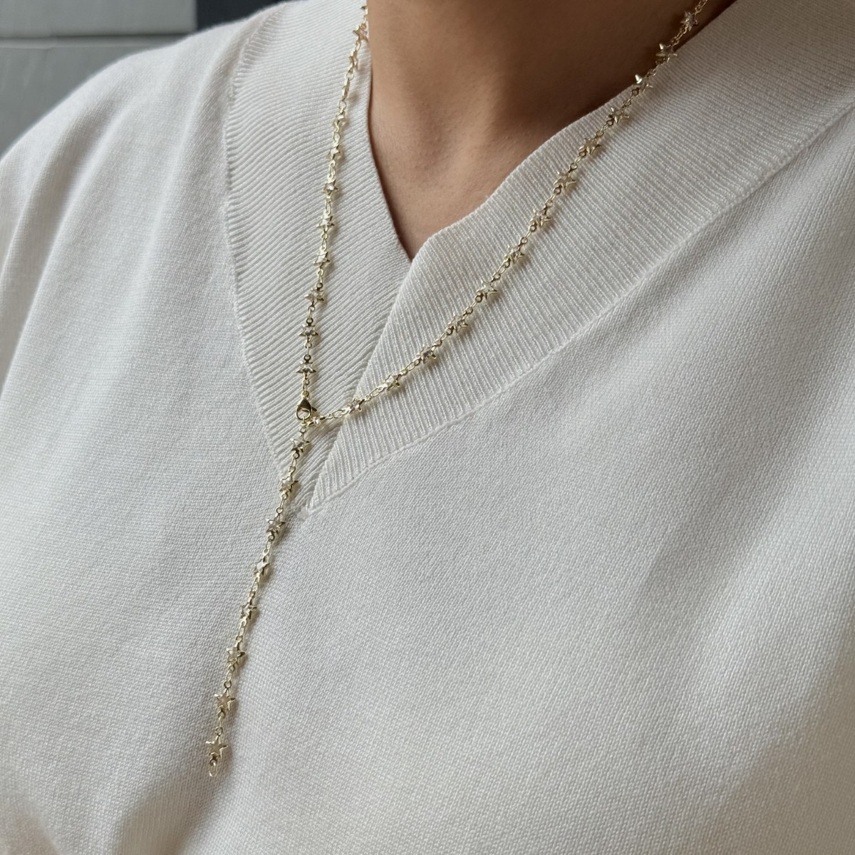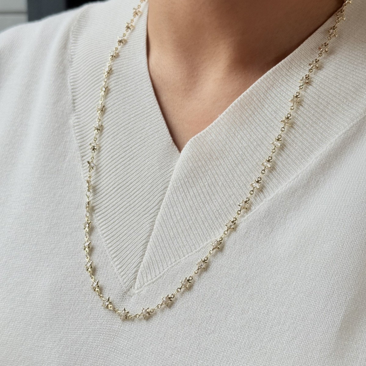 Küçük yıldız formlarına yerleştirilmiş taşlar, gökyüzünün ışıltısını boynunuza taşır. Minimal ve romantik bir dokunuş.