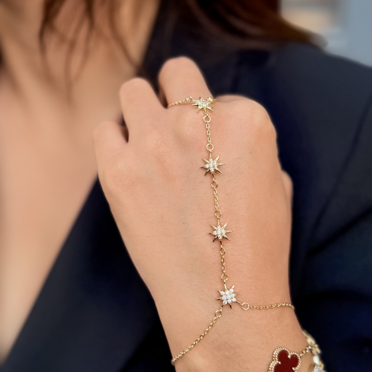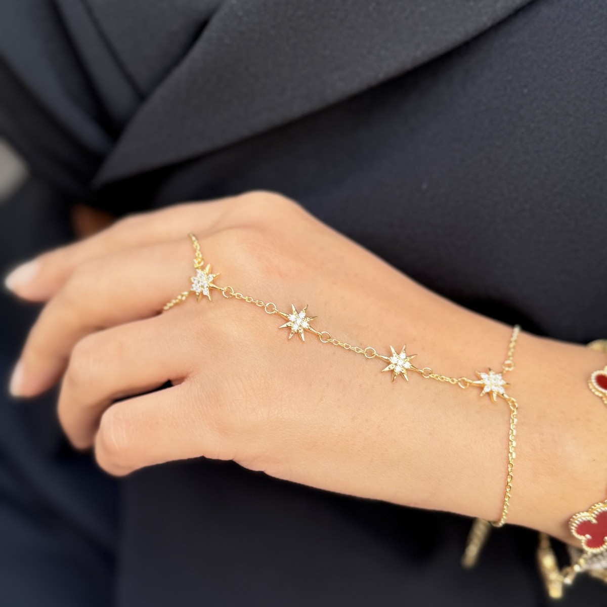 Minik yıldız süslemeler parıltılı bir hat ile bileğe uzanır; zarif ve hafif.