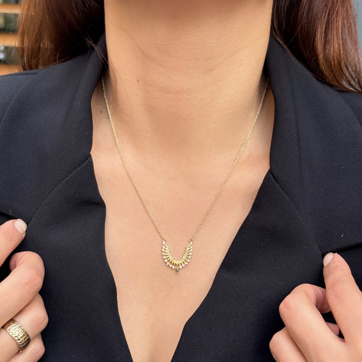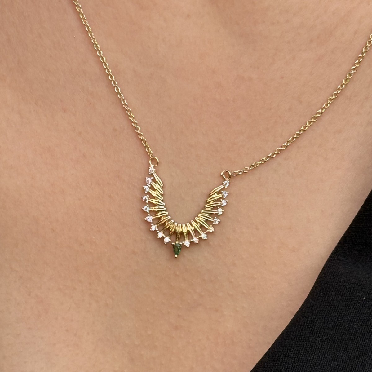 V formu ve merkezde yeşil damla detaylı, ışıltılı taşlarla tasarlanmış kolye.