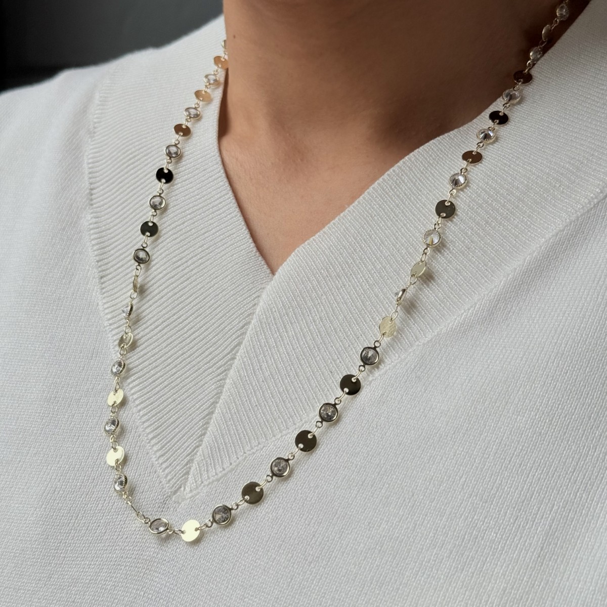 Parlak yuvarlak taşların altın disklerle birleştiği bu kolye, hem hareketli hem de zarif bir dokunuş sunar.