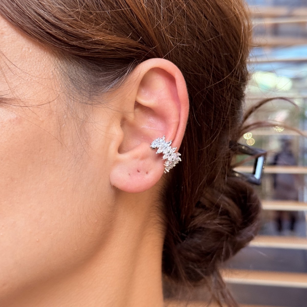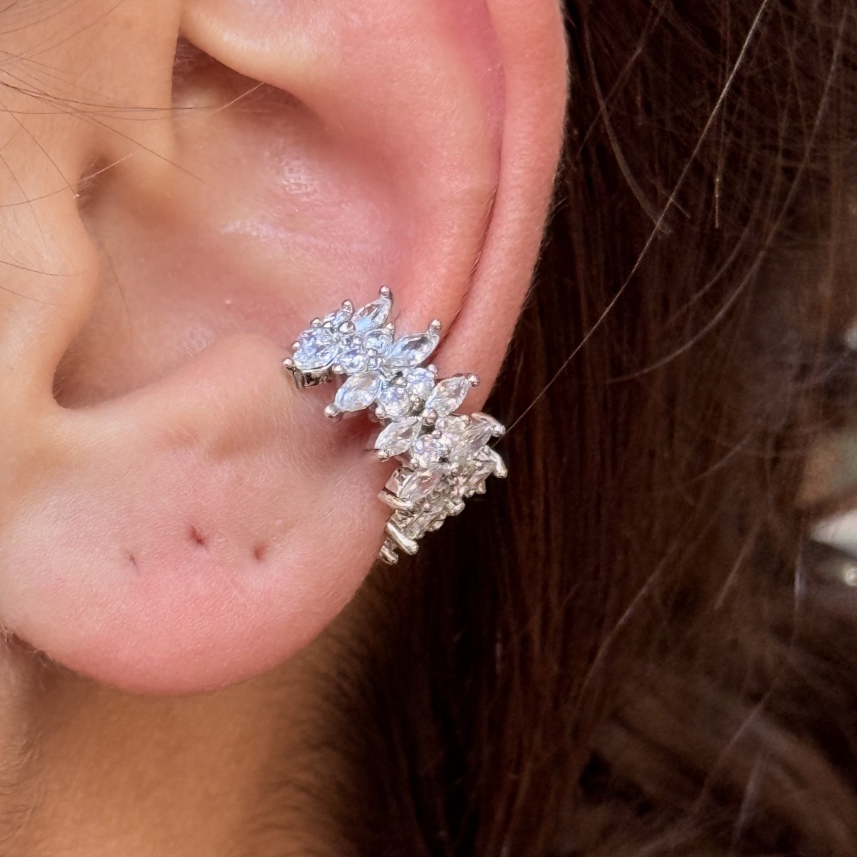 Birden fazla taşın çiçek formunda dizildiği bu kıkırdak, kulağınızı adeta bir bahçeye dönüştürüyor. Piercing gerektirmeden takılan bu model, hem günlük kombinlerde zarif bir hava katar hem de özel günlerde ışıldayan bir aksesuar olur