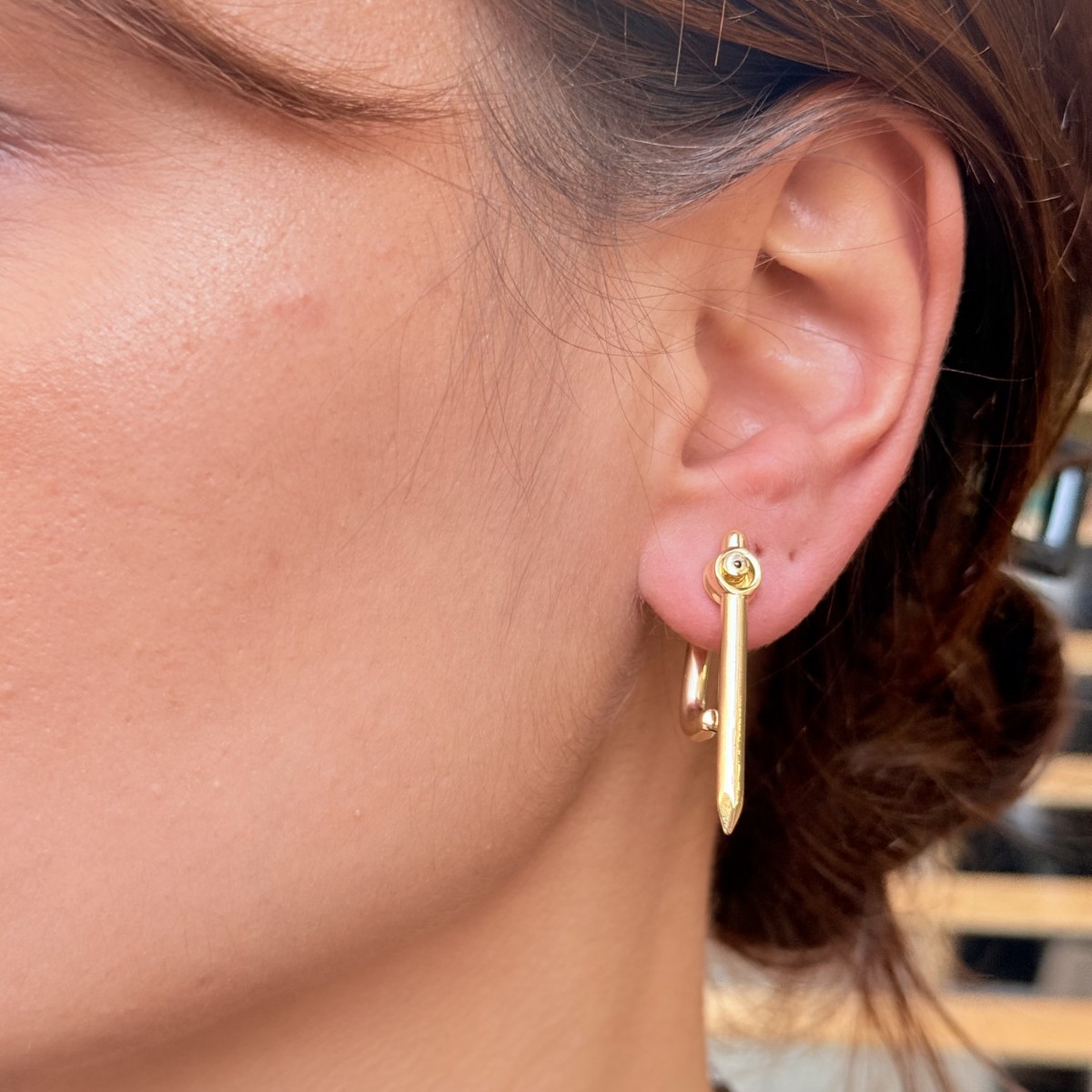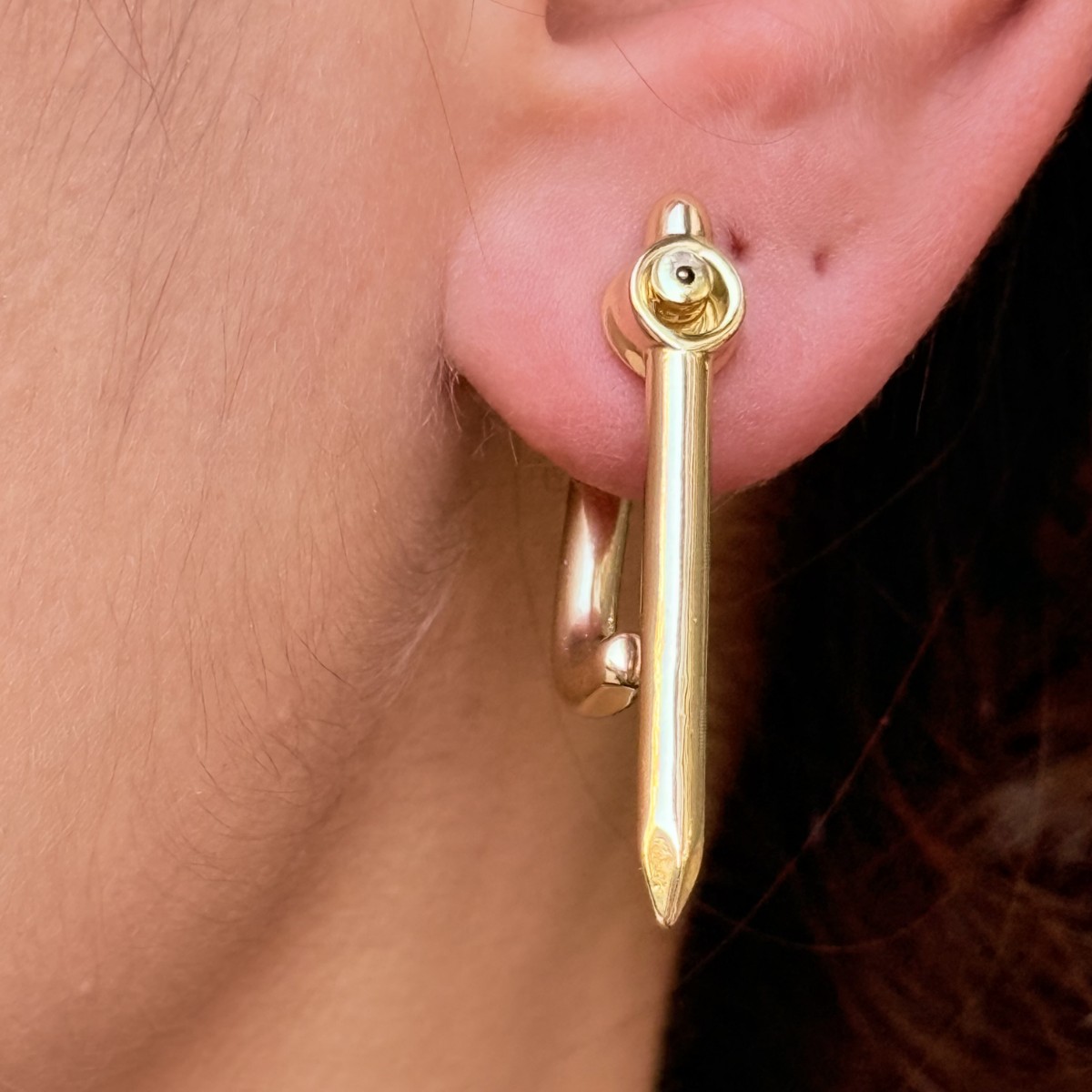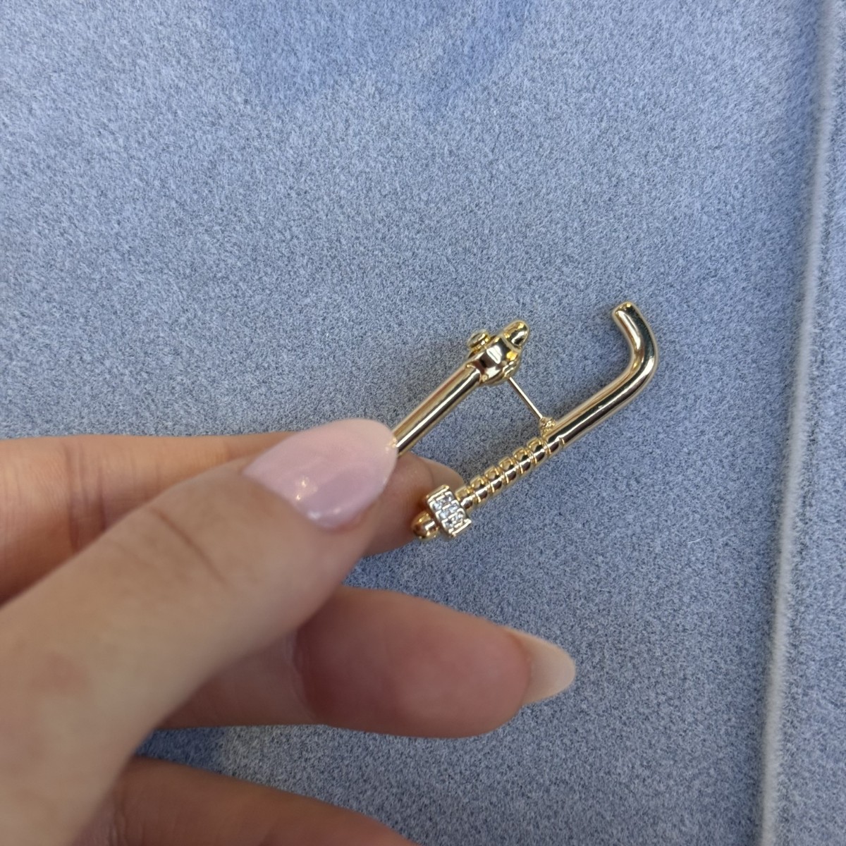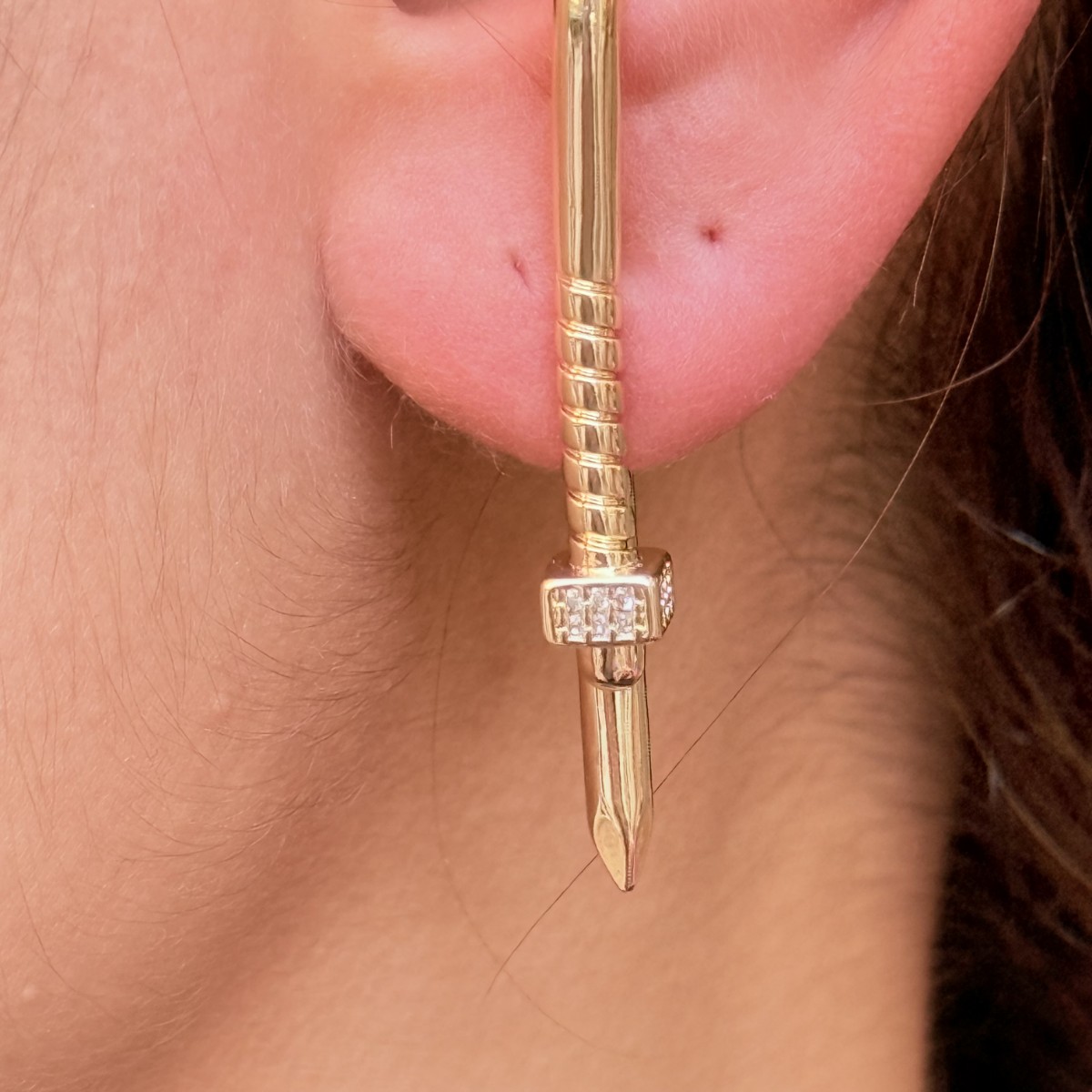 Altın çivi formu, pırlanta detaylı baş kısmıyla iddialı ve cesur bir görünüm.