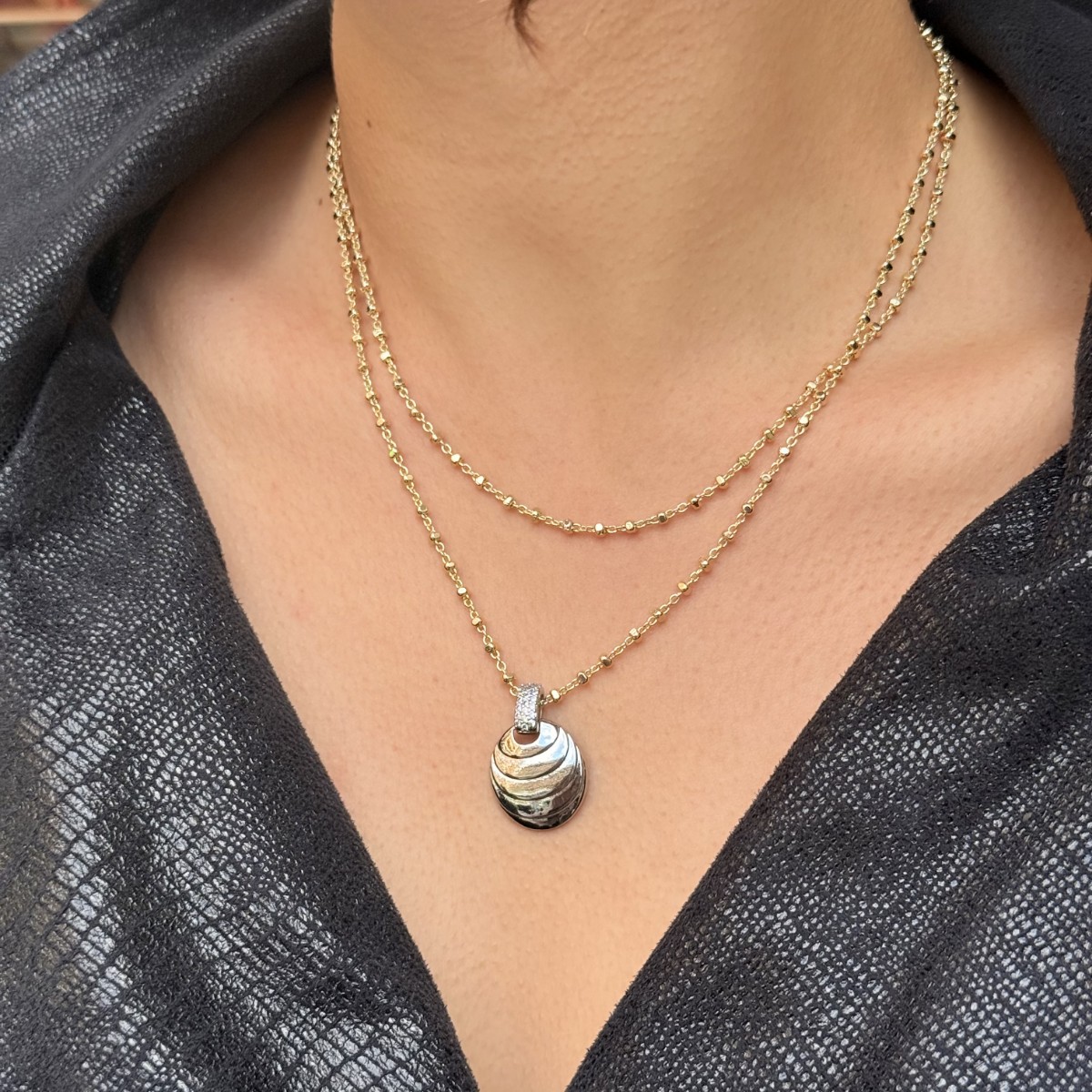 Zincirin katmanlı formu ve dalgalı yüzeyiyle modern bir ışıltı sunar; sade tarzlara zarif bir derinlik katar. Ürün uzundur, görselde iki kat dolanmıştır.