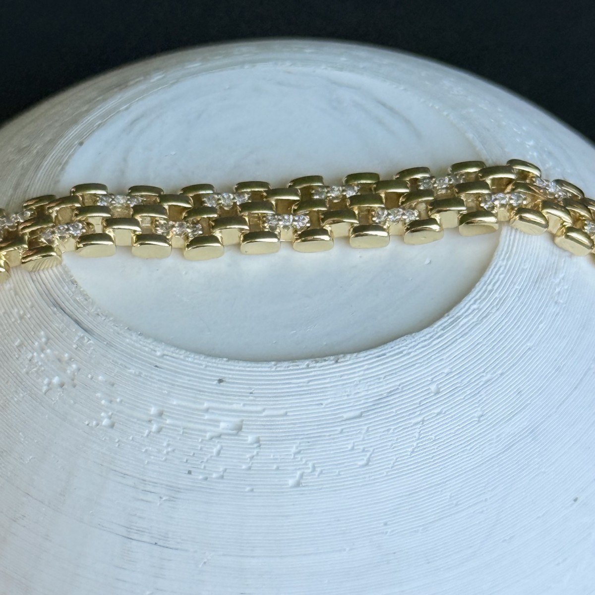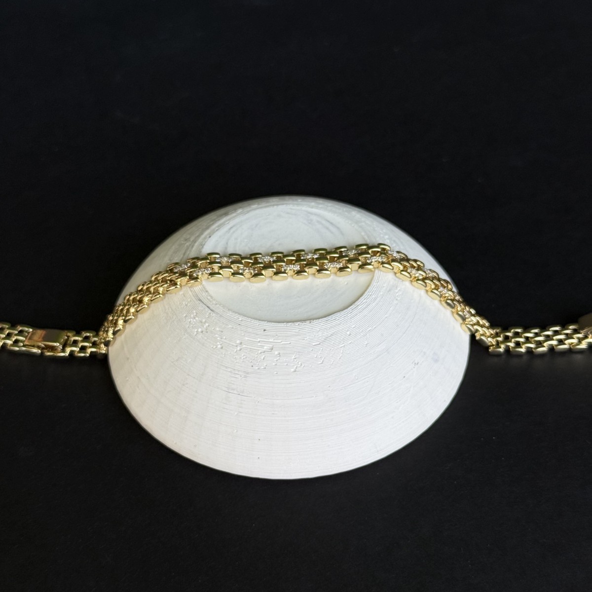 Altın tonundaki minik yuvarlak halkaların arasına taşlar serpiştirilerek hazırlanmış, çift sıralı zarif bir tasarım. İnce yapısıyla günlük kullanıma uygun, aynı zamanda katmanlı takılarda şık bir tamamlayıcıdır.