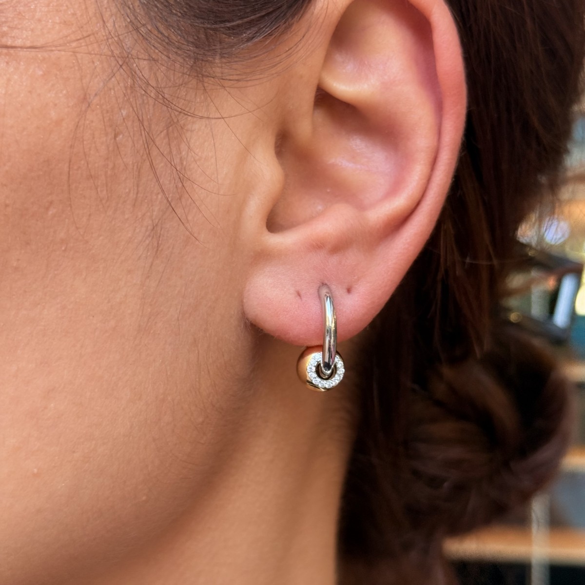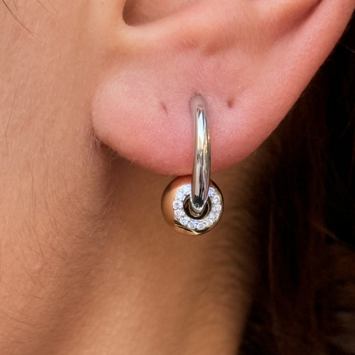 İçi taşlarla süslü yuvarlak form, gümüş ve altın ton birleşimiyle modern ve sofistike bir görünüm sağlar.