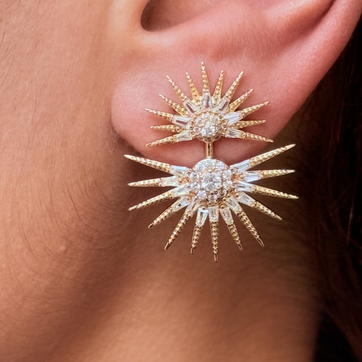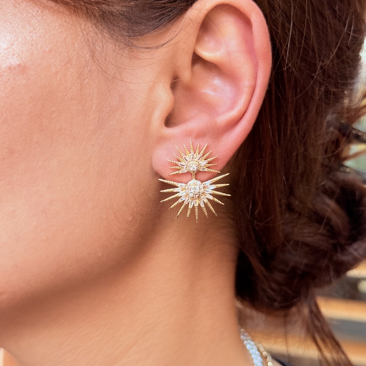 Altın rengin sıcak tonlarıyla buluşan bu güneş tasarımlı küpe, ihtişamı ve zarafeti bir arada sunuyor. Işıltılı taşlarla zenginleştirilmiş tasarım, hem şık elbiselerle hem de sade kombinlerle göz alıcı bir uyum yakalıyor.