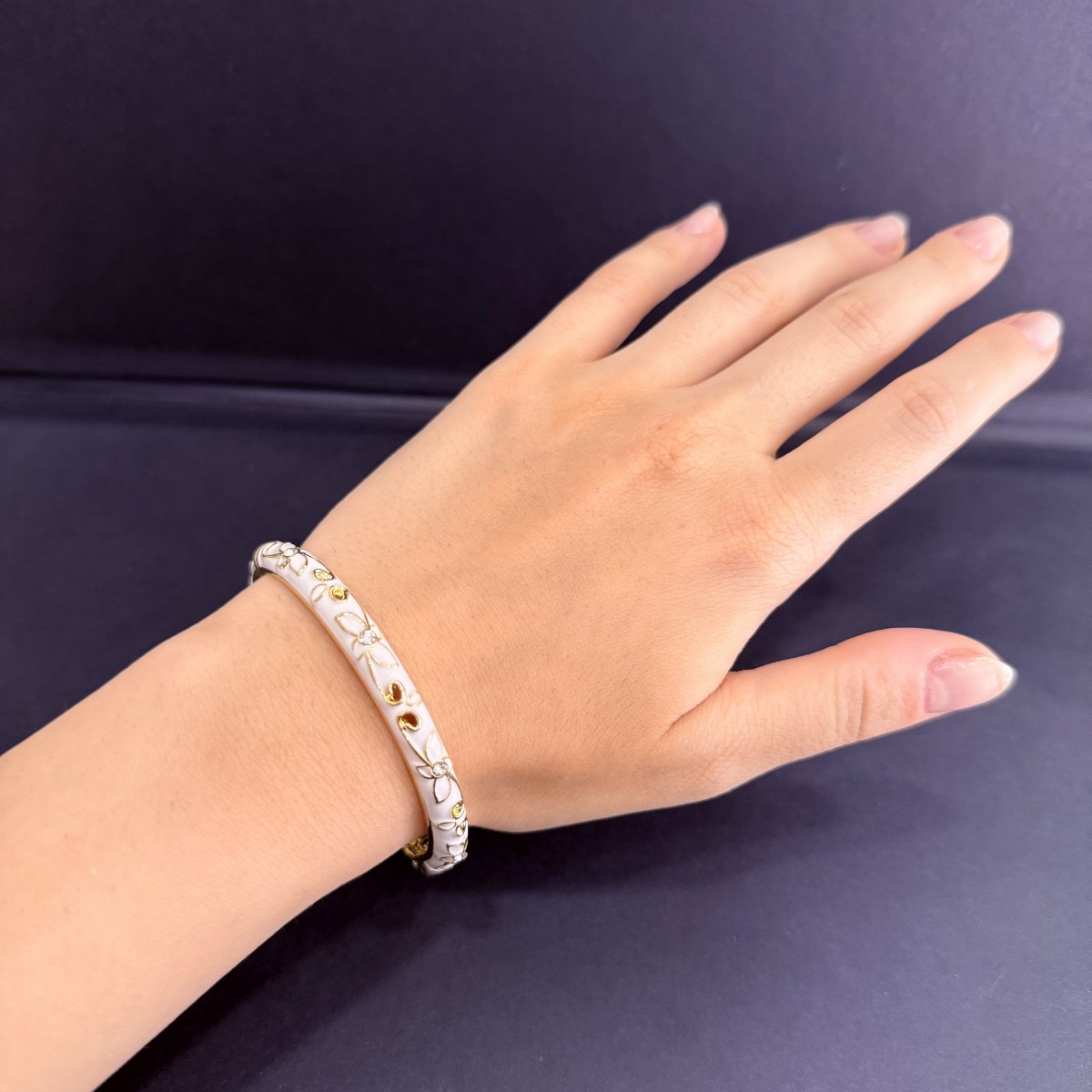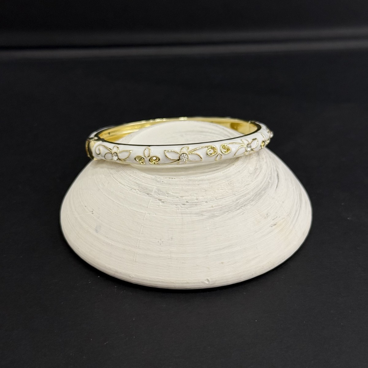 Beyaz mine üzerine işlenmiş altın çiçek motifleriyle dikkat çeken bu bileklik, Daisy Koleksiyonu’nun zarif ve modern çizgisini yansıtır. Paslanmaz çelik gövdesi sayesinde uzun süre parlaklığını korur.