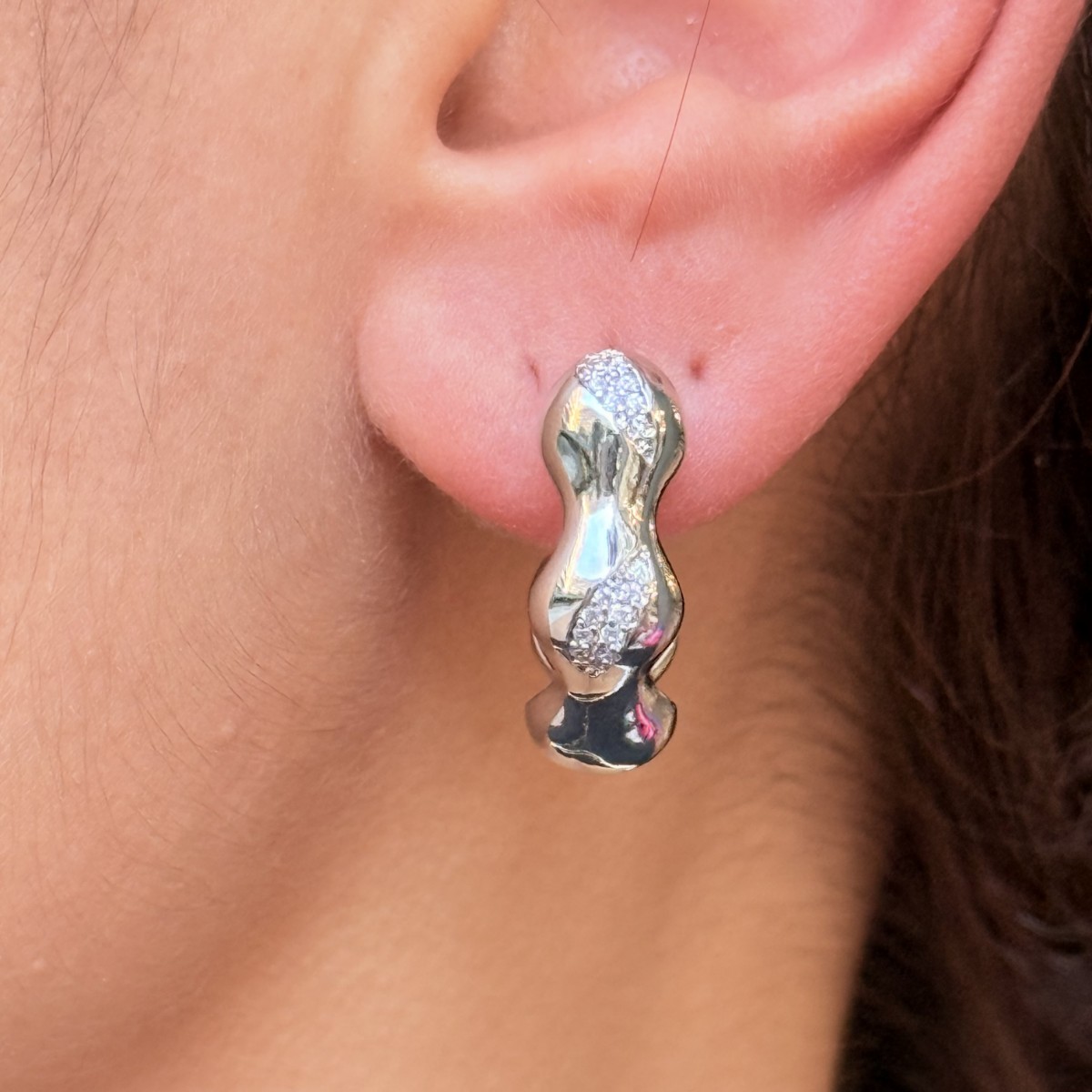 Gümüşün kıvrımlı formu ve taş dokunuşları, kulağınızda zarif bir dalga gibi.