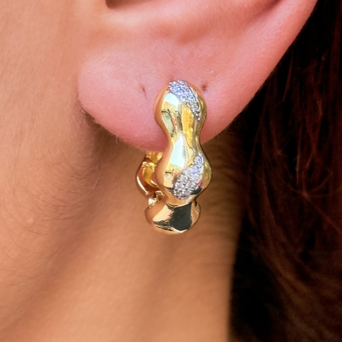 Dalgalı altın form ve taş detaylarıyla tasarlanan bu klasik küpe, kıkırdaklardan farklı olarak kulak memesine takılır. Modern ve şık bir görünüm arayanlar için zarif bir alternatif.