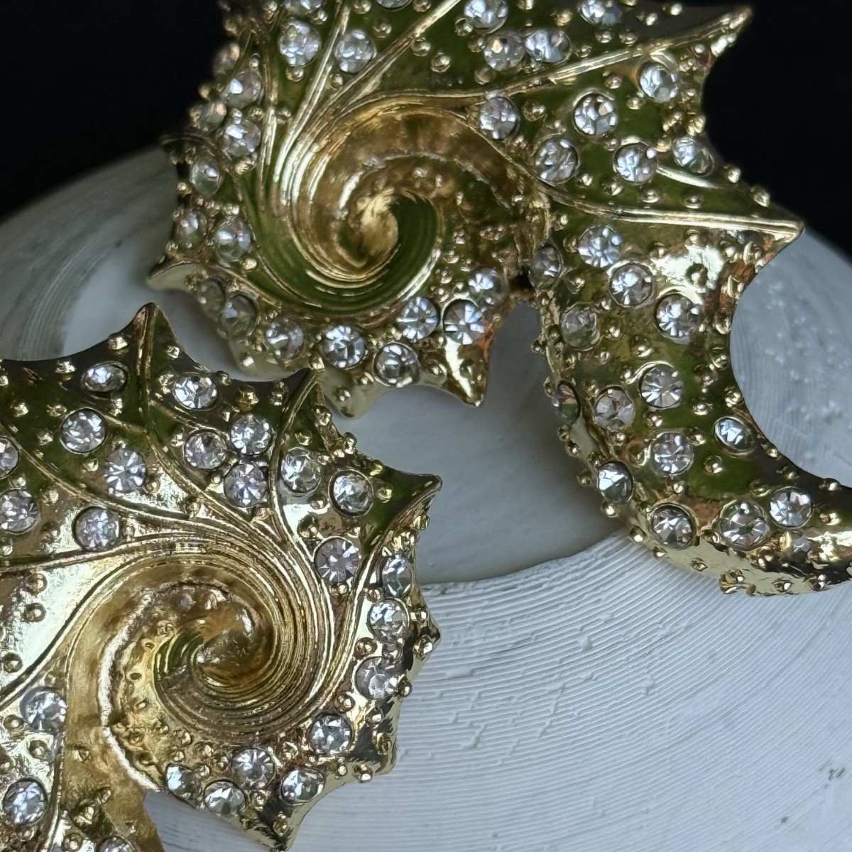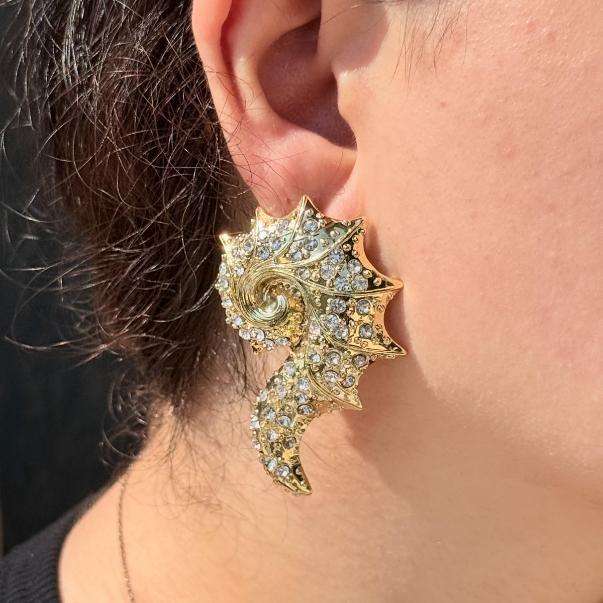 Deniz atı formunda tasarlanan bu küpe, altın tonları ve parlak taş süslemeleriyle oldukça iddialı bir model. Yaz akşamları ya da özel davetler için eşsiz bir tamamlayıcı parça.