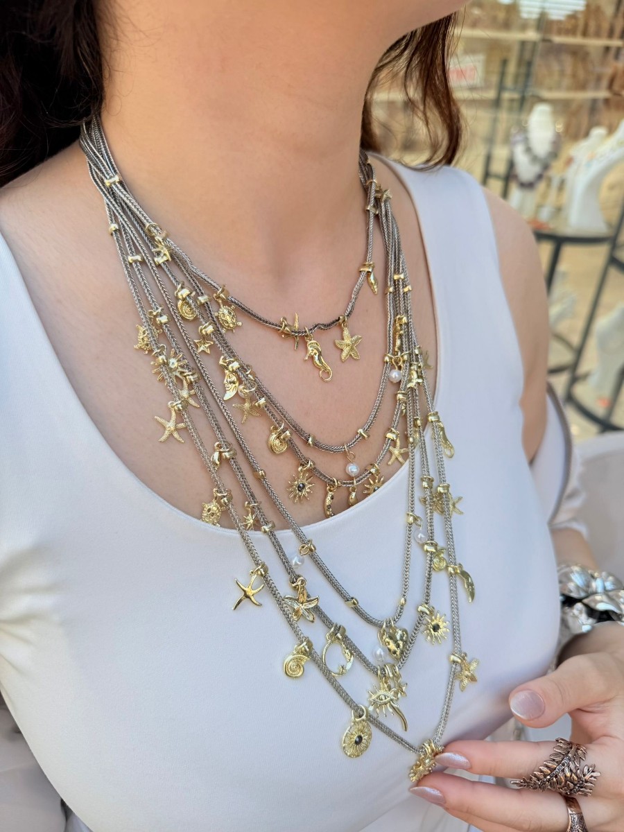 Deniz yıldızları, midyeler, ay ve güneş sembolleriyle dolu bu çok katmanlı kolye, adeta sahil havasını boynunuza taşıyor.