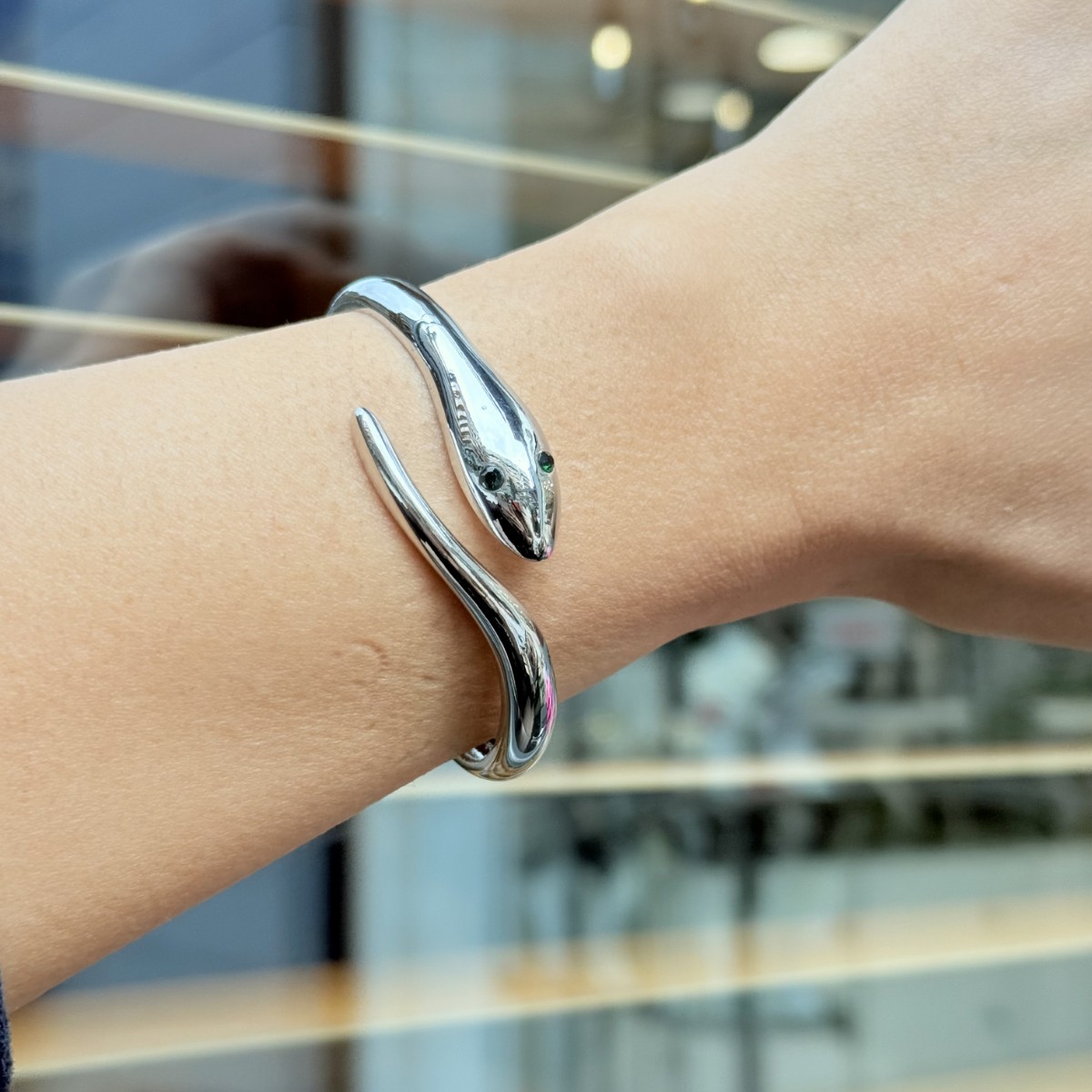 Yeşil taşlı gözleriyle karakteristik görünüm kazanan, esnek formlu yılan bileklik.