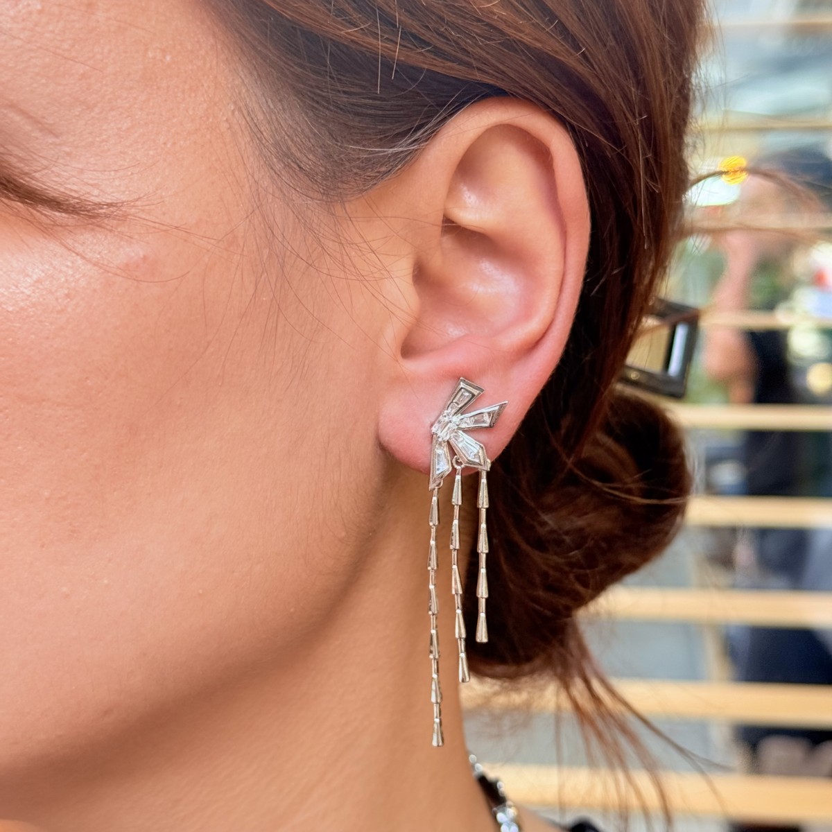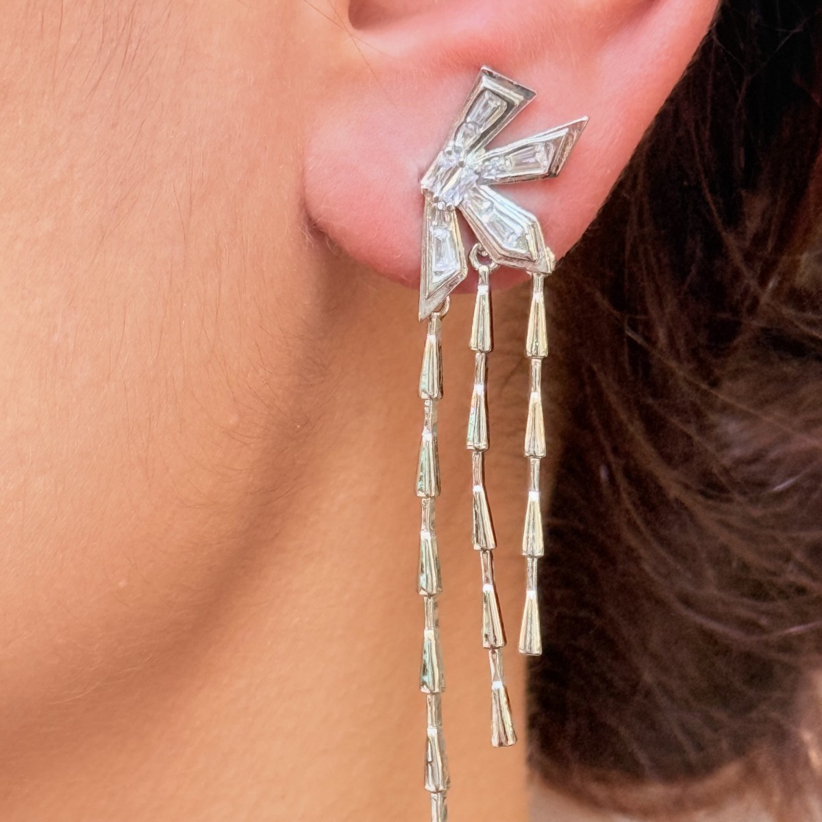 Keskin hatlı taşlı üst kısım ve zincir sarkıtlar, kulakta modern bir geometri yaratıyor.