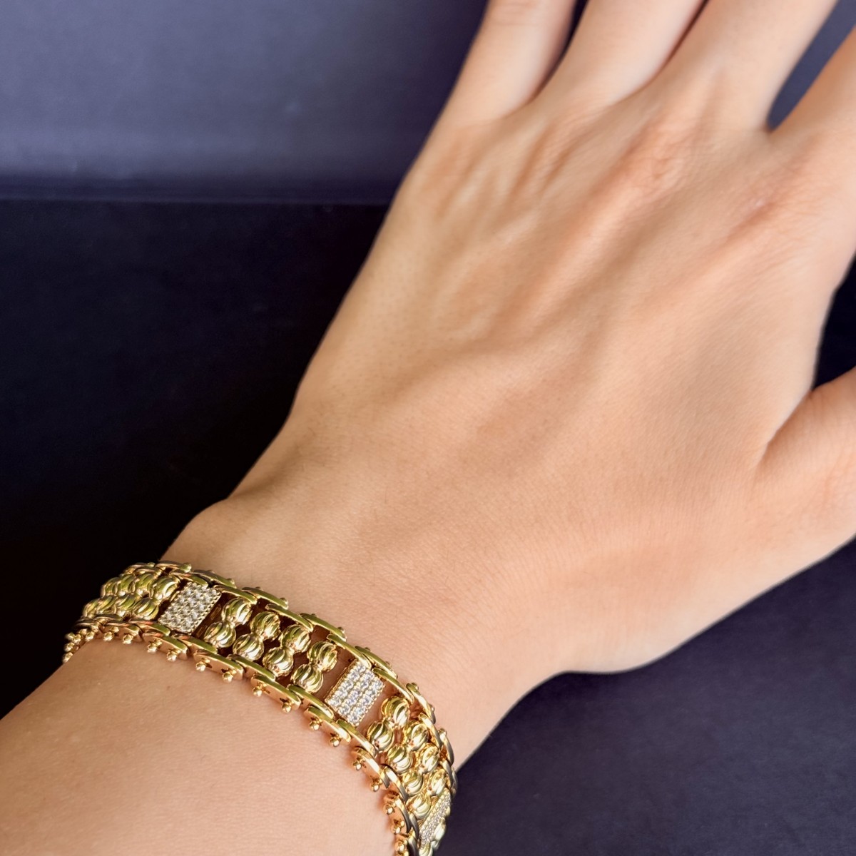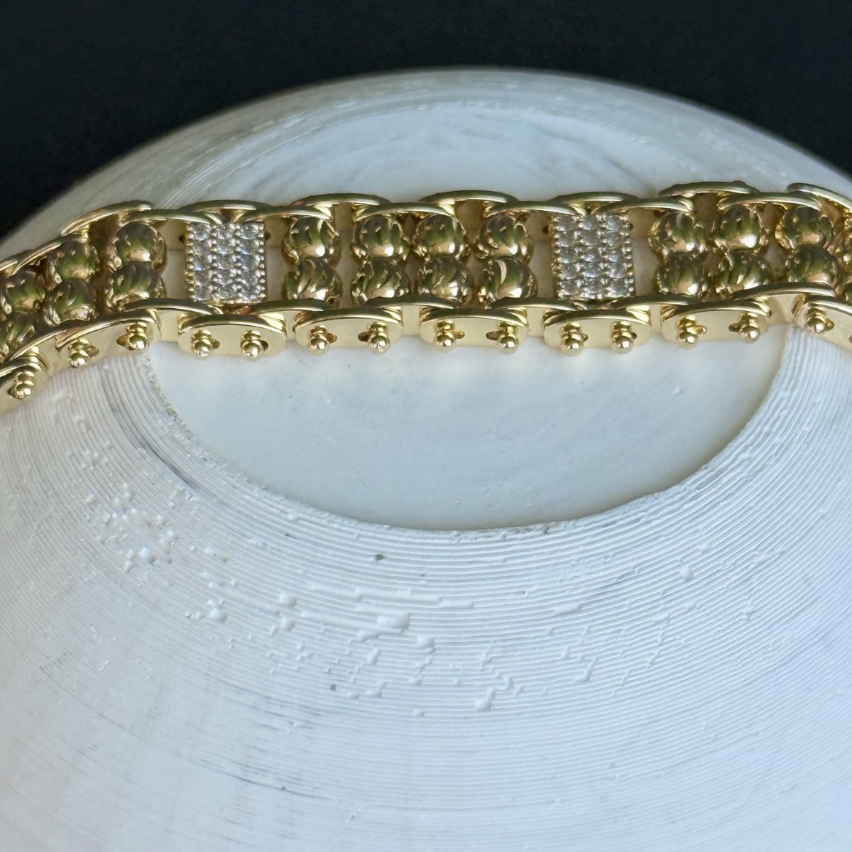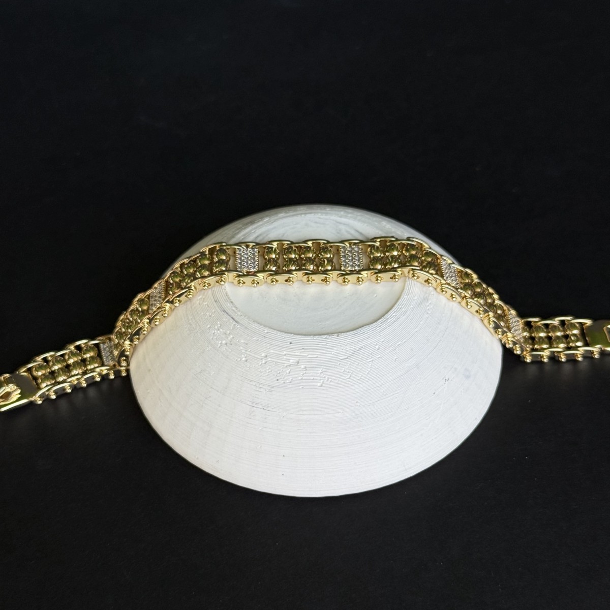 Altın yuvarlak halkaların içine oturtulmuş küçük taş dizilimleriyle dikkat çeken bu tasarım, klasik zincir formuna modern bir yorum katıyor. Parlak yüzeyi ve taşlı detaylarıyla sade kombinlerde öne çıkan bir parçadır.