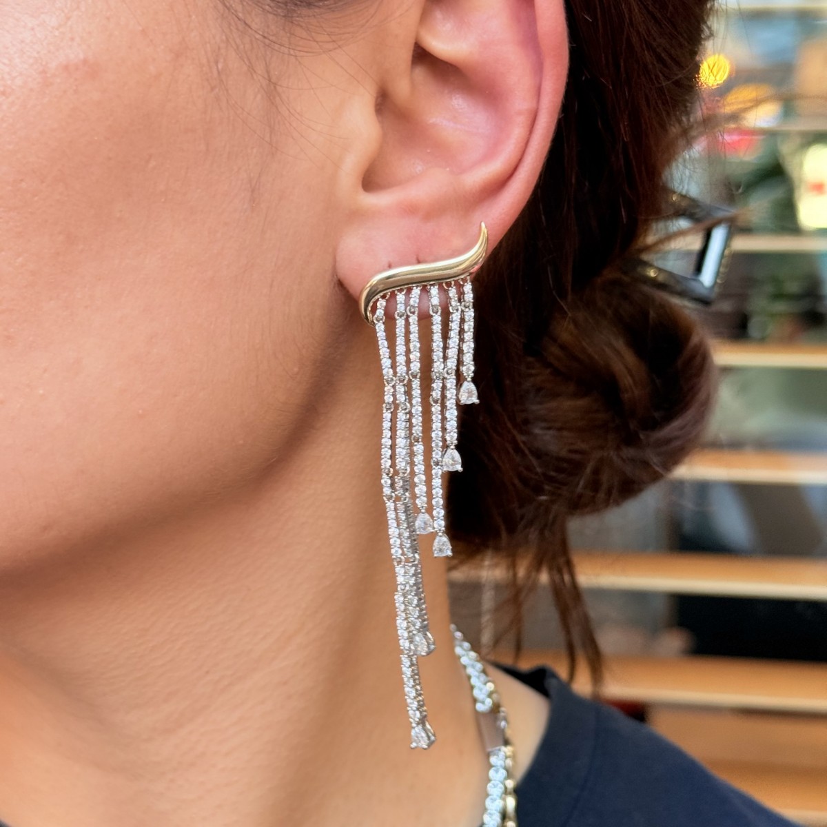 Zarif altın kıvrımdan süzülen taşlı zincirler, kulağınızda adeta ışık şelalesi gibi dans eder. Akışkan ve gösterişli tasarımıyla gece stillerine büyüleyici bir dokunuş katar.