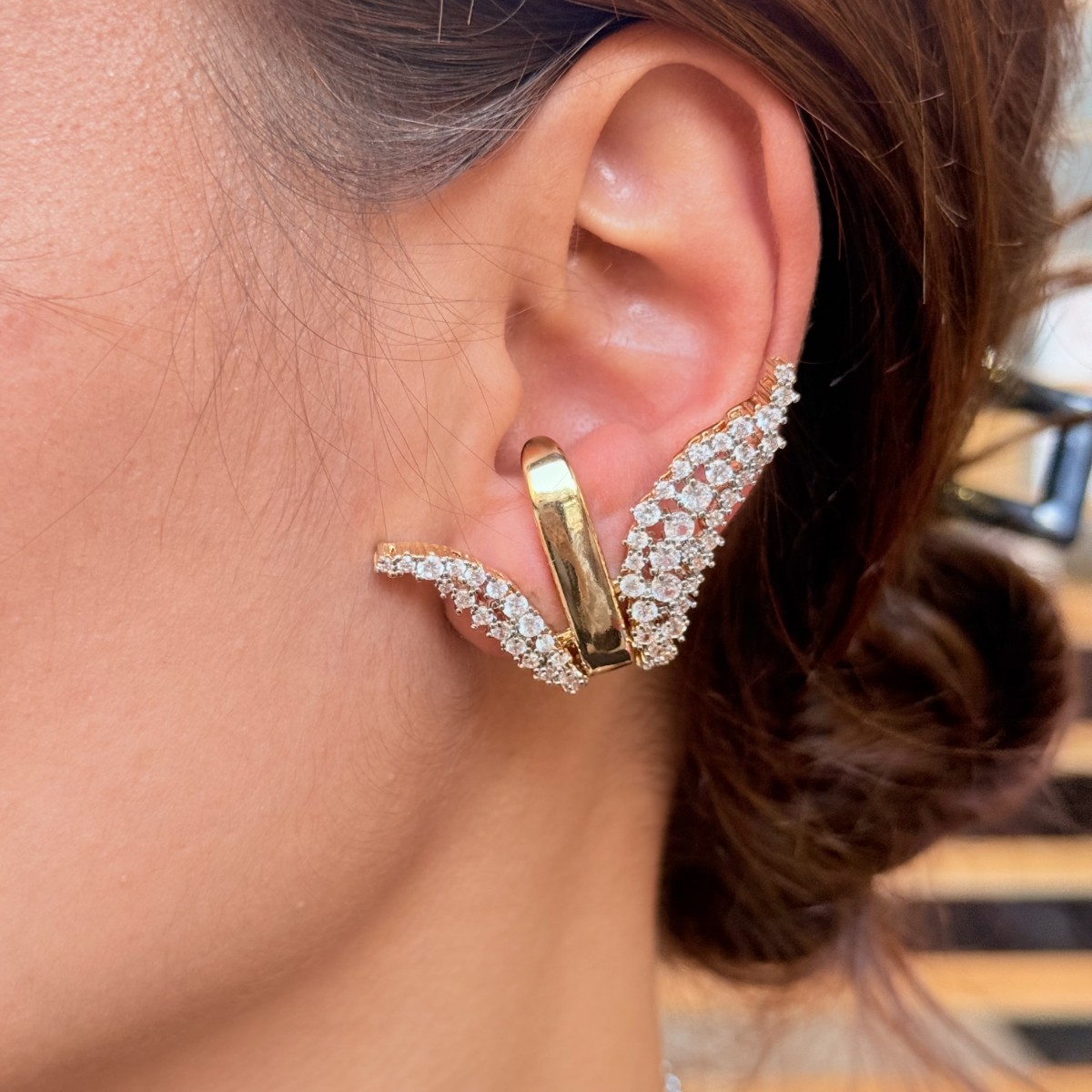 Altın ton üzerine kanat formunda pırlanta dizaynıyla kulakta bütünleşen zarif tasarım.