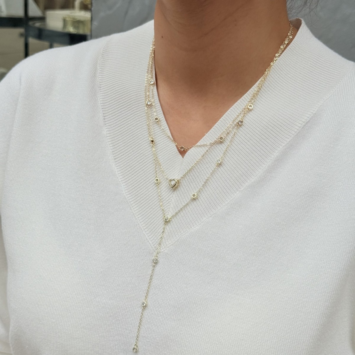 İnce zincirlerin farklı katmanlarla birleştiği bu model, küçük taşlar ve kalp figürüyle romantik bir şıklık sunar. Katmanlı kolye trendini sevenler için özel bir parça.