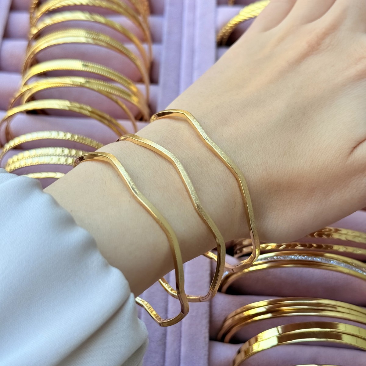 Dalgalı hatların mat dokuyla birleştiği bu model, ışıltıyı yumuşak bir şekilde yansıtarak farklı bir derinlik kazandırır. Günlük kullanımda dikkat çekici bir alternatif.