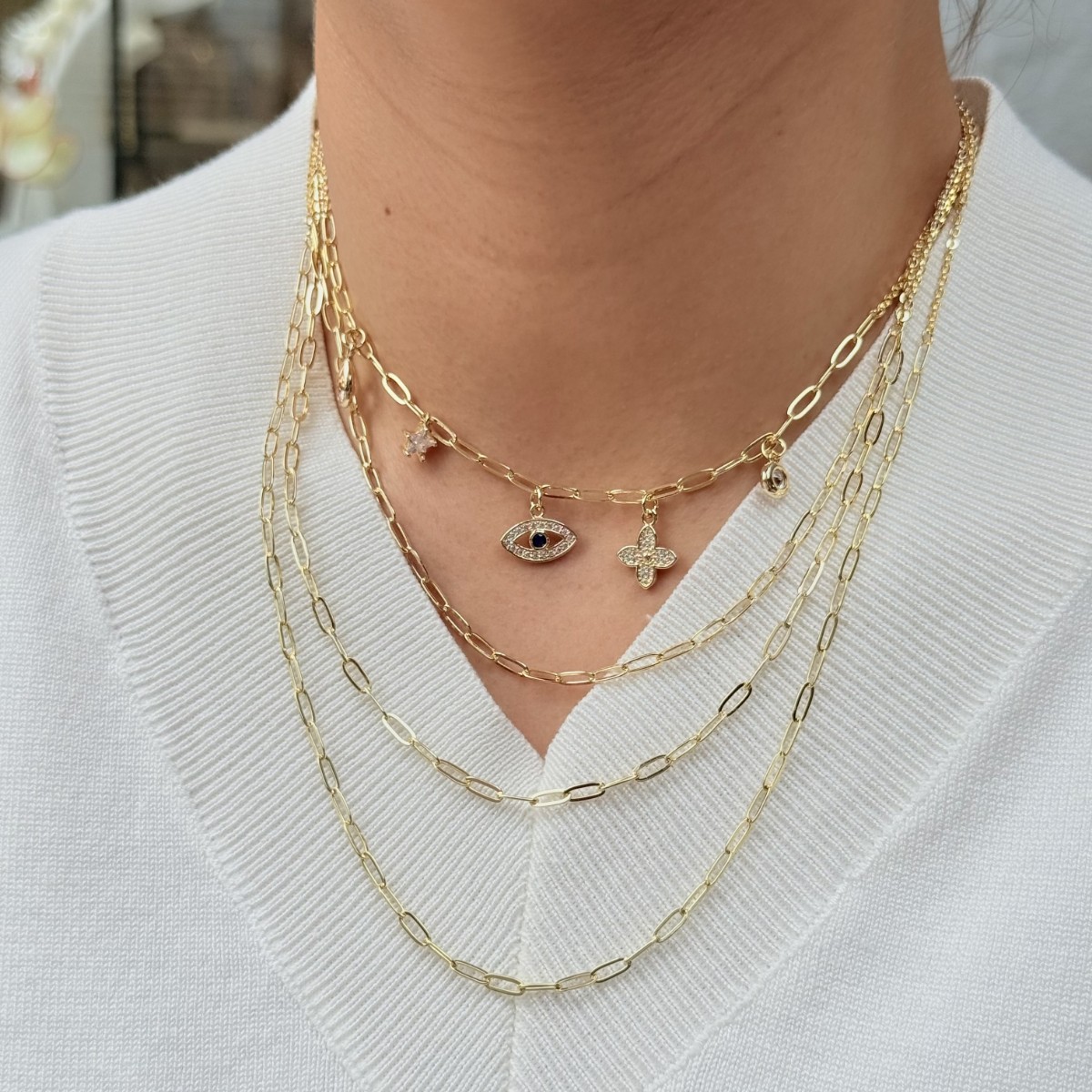 Nazar boncuğu, yonca ve yıldız figürlerinin birleştiği bu çok katlı kolye, hem anlamlı hem de şık bir stil yaratır.