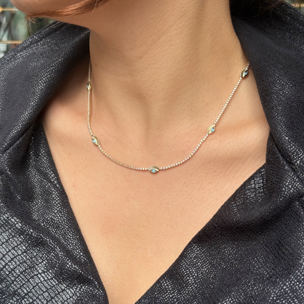 Göz formundaki mavi taşlar ve altın detaylar, koruyucu bir anlam taşır. Klasik nazar temasının modern yorumu.