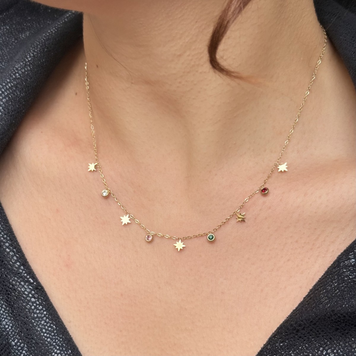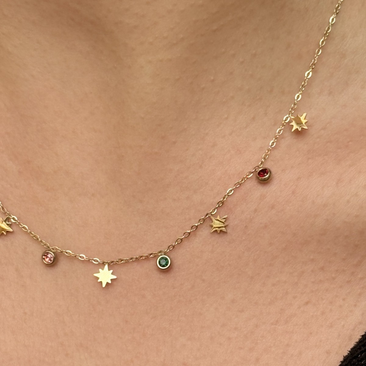 Zarif zincirine serpiştirilen yıldız ve renkli taş detaylarıyla, sade görünümlere canlı bir dokunuş ekler. Paslanmaz çeliktir.