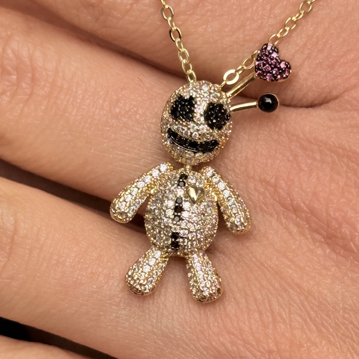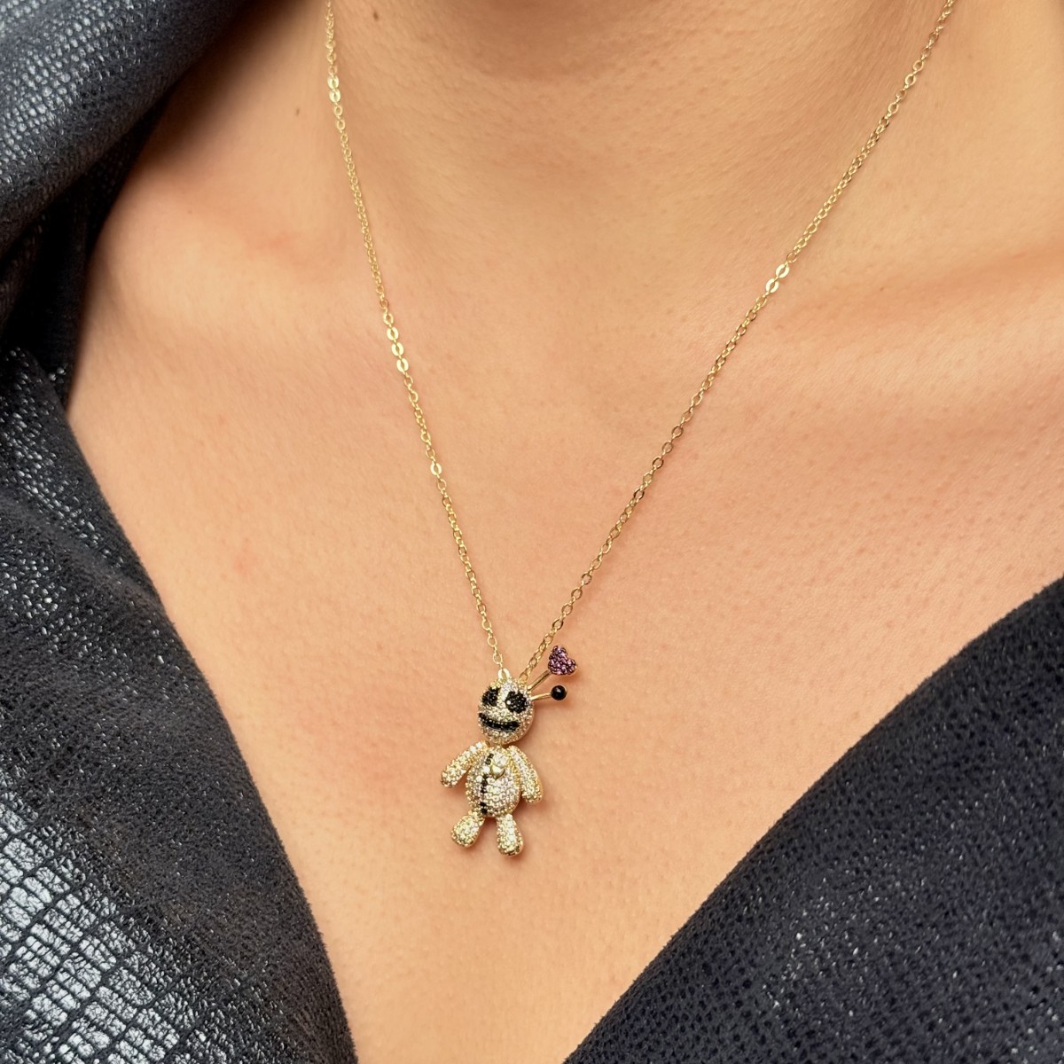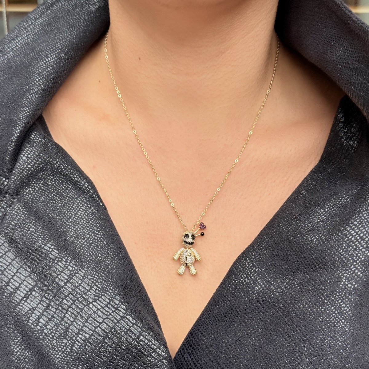 Renkli taş işlemeleriyle öne çıkan, karakterli ve eğlenceli tasarıma sahip figür kolye.