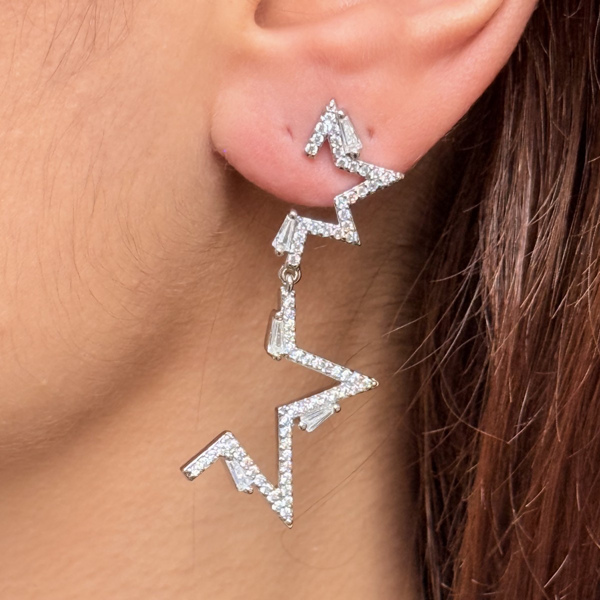 Şimşek formunda sallantılı küpe; tamamı pave mikro taşlı, baguette kesim detaylarla vurgulu. Gümüş ton.