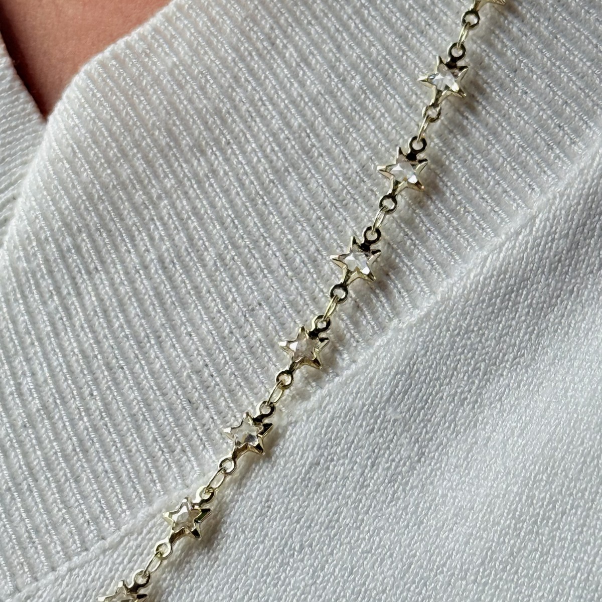 Küçük yıldız formlarına yerleştirilmiş taşlar, gökyüzünün ışıltısını boynunuza taşır. Minimal ve romantik bir dokunuş.