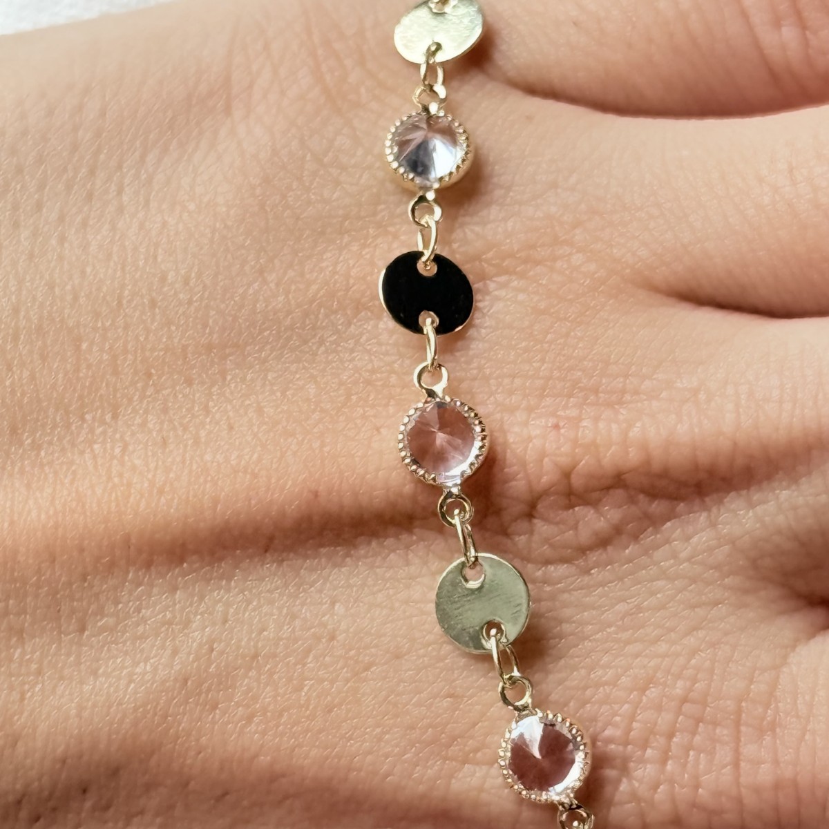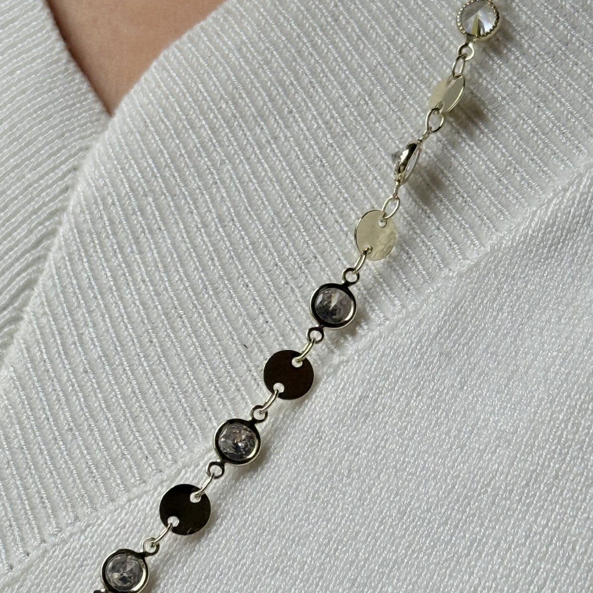 Parlak yuvarlak taşların altın disklerle birleştiği bu kolye, hem hareketli hem de zarif bir dokunuş sunar.