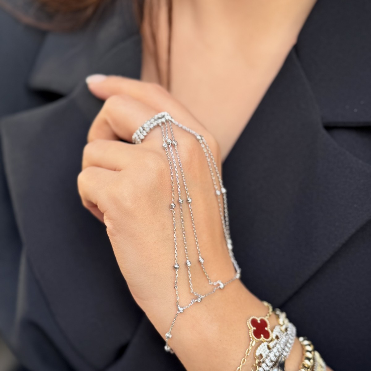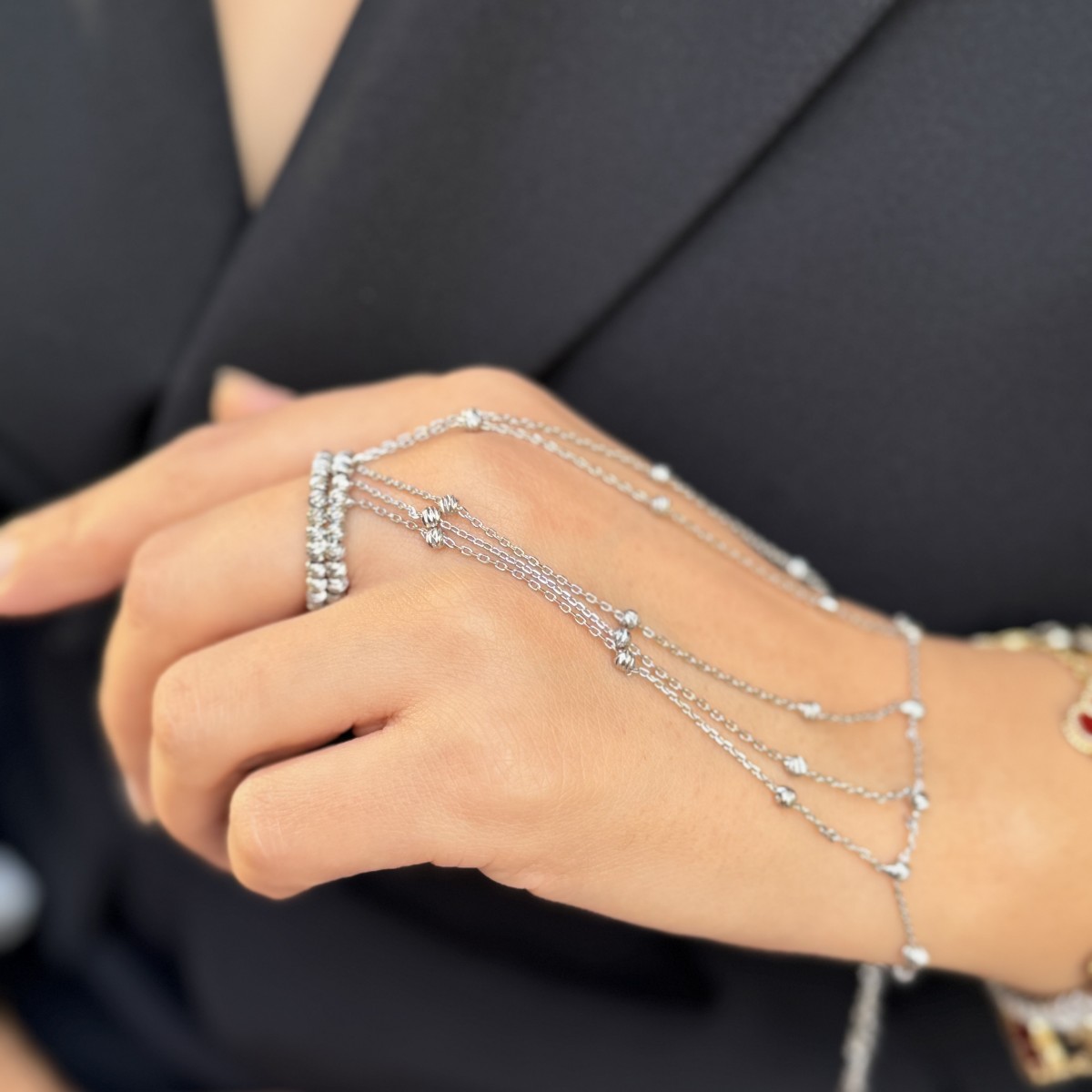Çok sıralı zincir ve taşlı halka geçiş; parlak gümüş tonlu modern görünüm.